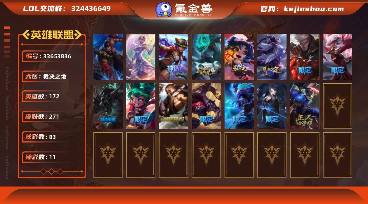 t40036【裁决之地】 271皮肤 83炫彩 11臻彩 4神话/35限定/27传说/172英雄 账号等级:1002 云顶神话:1 单双排段位:翡翠 【重要头像】魔女艾希炫彩 【重要皮肤】胜利行刑官德莱文 胜利剑圣易 胜利女神娑娜 胜利巨口克格莫 荣誉使者玛尔扎哈 玉剑传说舞龙卫 点心宝贝阿木木 天龙之子斯莫德 广寒仙子嫦娥 龙马烈焰波比 胜利女神奥莉安娜 灵魂收割者索拉卡 南瓜头王子阿木木 SSW泰隆 SKTT1李青 暗杀星蒙多 Fnatic古拉加斯 防暴天使凯尔 冠军典狱长锤石 鬼影重重魔腾 胡桃夹子萨科 南瓜头费德提克 圣诞精灵崔丝塔娜 圣诞老人古拉加斯 无头骑士赫卡里姆 雪默丁格 野兽猎人德莱文 征服者卡尔玛 征服者韦鲁斯 暗影沃里克 冠军之箭艾希 波比的巧克力工坊 都铎王朝图奇 十五周年纪念希维尔 十周年纪念安妮 源代码乐芙兰 神凰行者瑞羽圣凰艾尼维亚 暗裔英雄盖伦 大元素使拉克丝 灵魂守卫乌迪尔 【传说皮肤】影执事劫 战斗学院凯特琳 第三类接触黑默丁格 黯黑魔龙希瓦娜 烈焰雄心崔丝塔娜 电玩女神娑娜 战地机甲厄加特 炼狱魔犬内瑟斯 律政大亨蒙多 霸天异形卡兹克 陆地王者4WD布里茨 女皇艾希 绅士科加斯 鬼魂新娘莫甘娜 女校长...