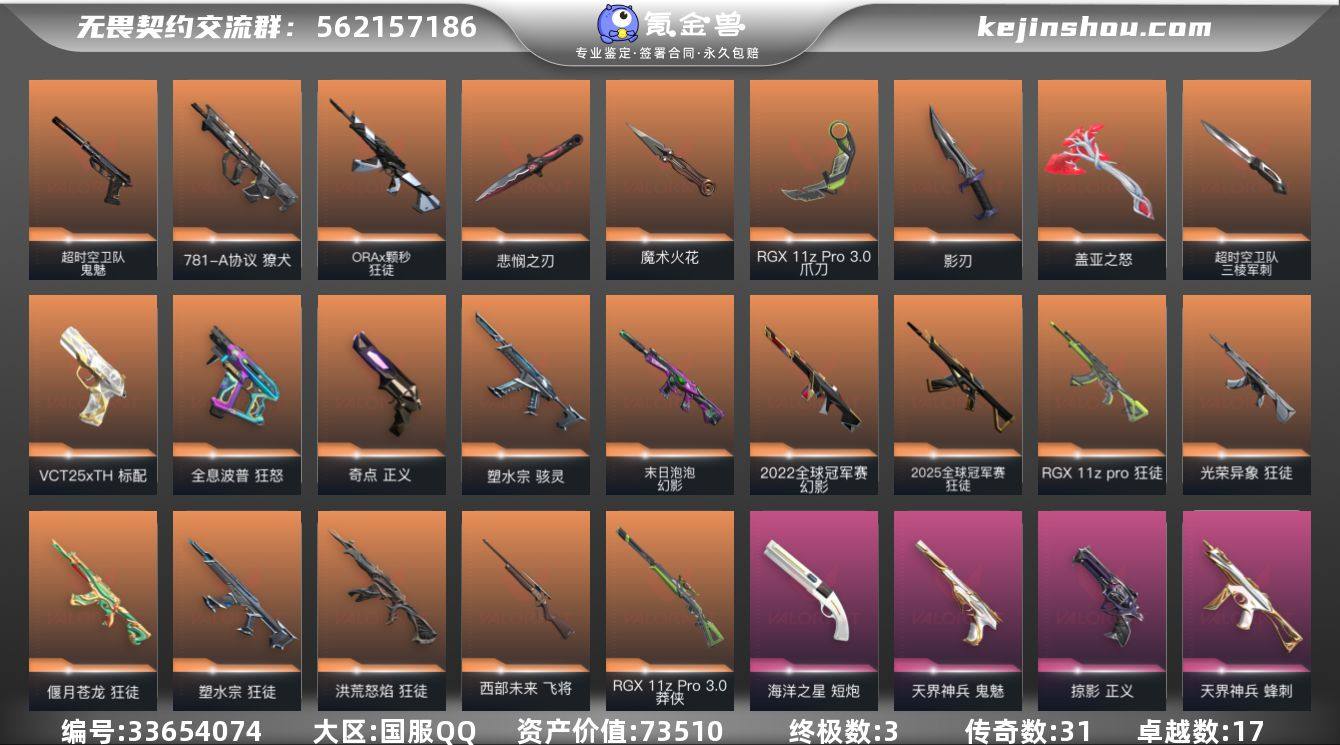 段位: 钻石 亮点皮肤: 幻影-2022全球冠军赛 近战武器皮肤: 盖亚之怒-盖亚的复仇,爪刀-RGX 11z Pro 3.0,影刃-掠影,超时空卫队 三棱军刺,魔术火花-奇幻朋克3.0,无畏契约季前邀请赛 悲悯之刃 步枪皮肤: 狂徒-紫阙金琅,狂徒-盖亚的复仇,狂徒-偃月苍龙,幻影-侦察力量,狂徒-塑水宗,獠犬-781-A协议,幻影-源能者危机001,狂徒-洪荒怒焰,狂徒-日冕雄师,戍卫-掠影,幻影-异鳞魔蛇,狂徒-RGX 11z pro,狂徒-光荣异象,幻影-奇幻朋克3.0,奇幻朋克3.0狂徒,幻影-末日泡泡,2025全球冠军赛 狂徒,狂徒-ORAx颗秒 佩枪皮肤: 正义-奇点,鬼魅-天界神兵,狂怒-全息波普,短炮-海洋之星,正义-掠影,标配-VCT25xTH,鬼魅-超时空卫队 狙击枪皮肤: 冥驹-堕天遗武,莽侠-RGX 11z Pro 3.0,飞将-西部未来 冲锋枪皮肤: 蜂刺-天界神兵,骇灵-塑水宗 霰弹枪皮肤: 雄鹿-紫阙金琅2.0,判官-天界神兵2.0 机枪皮肤: 奥丁-掠影2.0 亮点: 【充值总皮肤】: 影刃, 异鳞魔蛇 幻影, 塑水宗 狂徒, 超时空卫队 鬼魅, 全息波普 狂怒, 无畏契约季前邀请赛 悲悯之刃, 掠影//2.0 奥丁, 洪荒怒焰 狂徒, 紫阙金琅//2.0 雄鹿, 海洋之星 短炮, ORA x 颗秒 狂徒, 侦察力量 幻影, 超时空卫队 三棱军刺, 掠影 戍卫, 奇点 正义, 光荣异象 狂徒, 天界...