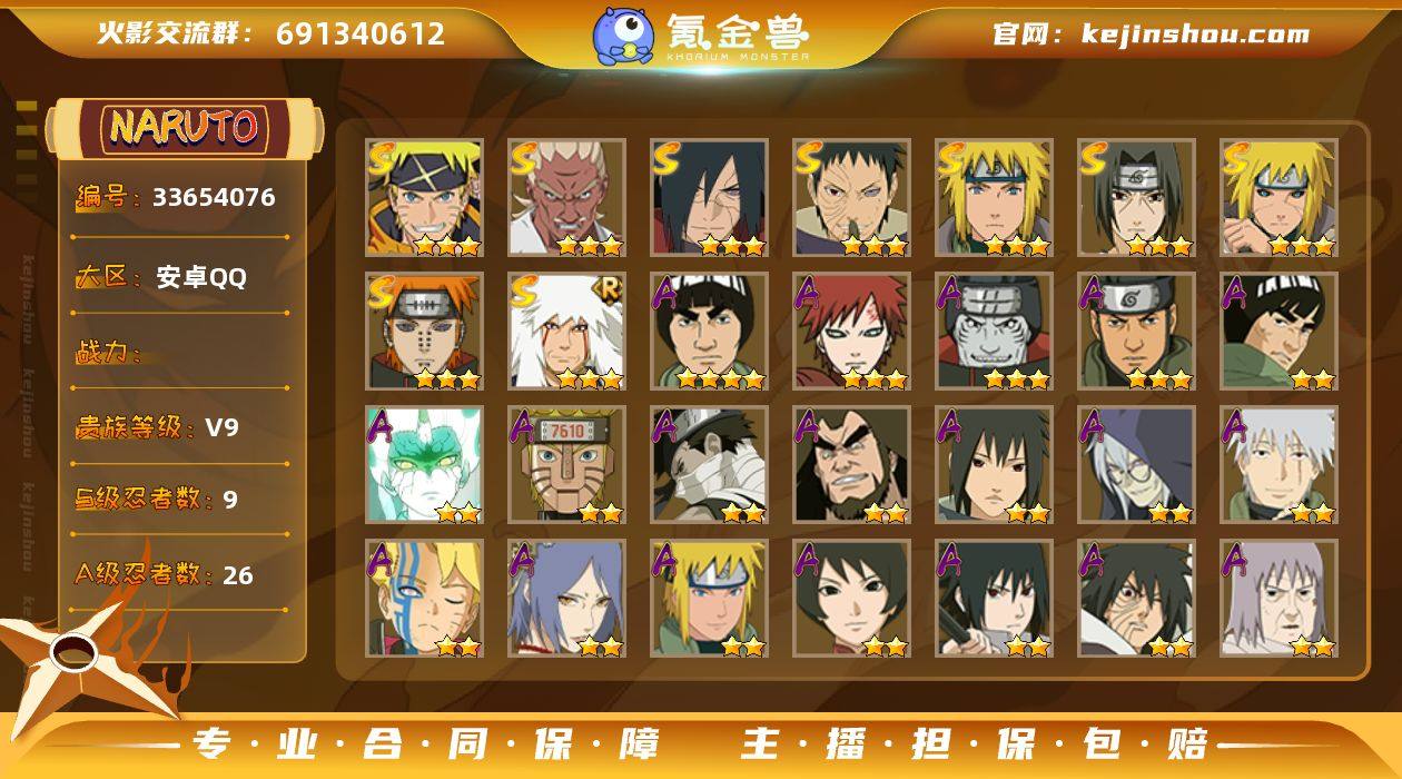 【HYX3787】VIP等级V9/S忍数量9/A忍数量26/二星A-飞段「死司凭血」/二星A-宇智波鼬/二星A-药师兜「侠隐江湖」/2星小南「神驹佑将」/三星S-宇智波带土 「忍界大战」/二星A-蝎/三星S-佩恩「天道」/三星S-漩涡鸣人·宇智波佐助/三星S-波风水门/三星S-波风水门「秽土转生」/二星A-秋道丁次「忍界大战」/二星A-漩涡博人「桃式显现」/三星A-干柿鬼鲛/三星A-我爱罗「疾风传」/二星A-波风水门 「青年」/三星S-自来也「舞之豪杰」/二星A-桃地再不斩「秽土转生」/四星A-迈特凯/二星A-宇智波带土「暴怒」/二星A-黑土「四代目土影」/二星A-飞段/二星A-神农 「羁绊」/二星A-宇智波泉奈/二星A-迪达拉/二星A-旗木卡卡西 「幻之真容」/二星A-巳月「仙人模式」/三星S-艾「忍界大战」/二星A-小南「漂泊浪客」/三星S-宇智波斑「秽土转生·解」/三星A-猿飞阿斯玛/二星A-迈特凯「青春爆炸」/二星A-宇智波佐助「须佐能乎」/二星A-机械鸣人「初始形态」/二星A-千代「近松十人卫」/三星S-宇智波鼬 「须佐能乎」
