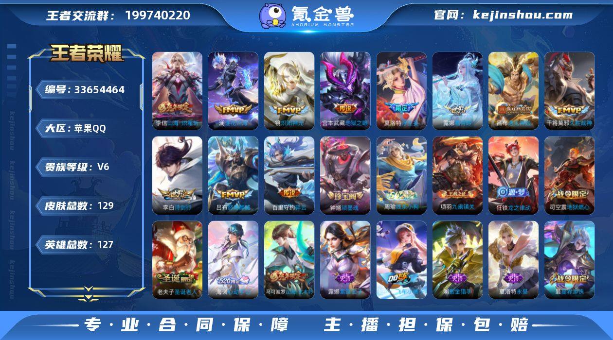 安卓QQ可二次实名 人脸可换 129皮|11传说皮 李白诗剑行、露娜霜月吟、澜逐花归海、双吕布FMVP年限、镜炽阳神光、夏洛特年限 40限定皮+超多史诗传说,英雄几乎全满 对抗路42段,图鉴收藏拉满 账号干净无违规,可直接平台换绑,验号秒确认
