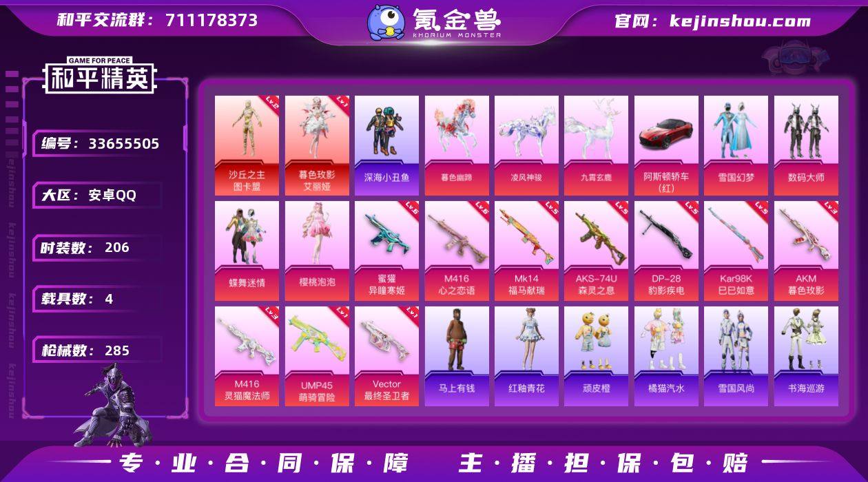 安卓 手Q-2神装-4粉装-10特效枪-4载具-9粉色飞行器-89301热力值-20王牌印记-206套装-285枪皮 【红色神装等级】:暮色玫影-艾丽娅(一级),沙丘之主-图卡盟(二级) 【红色角色神装】:暮色玫影-艾丽娅,沙丘之主-图卡盟 【热门品类】:粉装-雪国幻梦,套装-深海小丑鱼,套装-龟仙人,套装-潮萌小黄鸭 【粉色套装】:粉装-数码大师,粉装-雪国幻梦,粉装-蝶舞迷情,角色-樱桃泡泡 【粉色枪皮等级】:AKM-暮色玫影(三级),M416-心之恋语(六级),M416-灵猫魔法师(三级),蜜獾-异瞳寒姬(六级),UMP45-萌骑冒险(一级),Vector-最终圣卫者(一级),AKS-74U-森灵之息(五级),Kar98K-巳巳如意(五级),Mk14-福马献瑞(五级),DP-28-豹影疾电(五级) 【粉色载具】:阿斯顿马丁DBS(红),暮色幽蹄,凌风神骏,九霄玄鹿 【粉色枪皮】:AKM-暮色玫影,M416-心之恋语,M416-灵猫魔法师,蜜獾-异瞳寒姬,UMP45-萌骑冒险,Vector-最终圣卫者,AKS-74U-森灵之息,Kar98K-巳巳如意,Mk14-福马献瑞,DP-28-豹影疾电 【粉色飞行器】:香车宝马飞行器,炫彩糖果飞行器,梦幻火箭飞行器,圣域金龙飞行器,终晖之翼飞行器,暮色之舞飞行器,云梦轻舟飞行器 【粉色降落伞】:梦幻火箭降落伞,星之信仰降落伞...