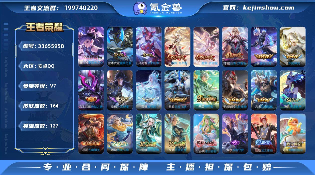 实名: 可修改 贵族等级: V7 英雄数: 127 皮肤数: 164 珍品传说: 酷洛米之心 星传说: 未来机甲,幽冥之眼 传说皮: 久胜战神,炽阳神光,一念神魔,地狱之眼,无双飞将,山海·炽霜斩,霜月吟,澜逐花归海 限定皮: 天狼溯光者,五谷丰年,怒海麟威,山海·玄木吟,鸣野蒿,愿照·岁时盈,愿照·九州拓
