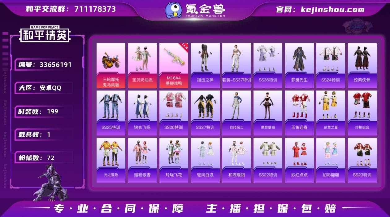 实名: 可修改 时装数: 199 载具数: 1 枪械数: 72 战备数: 65 热门装扮: 宝贝奶油派,梦魇先生 载具: 鬼马风驰 稀有枪皮: M16A4垂柳戏鸭