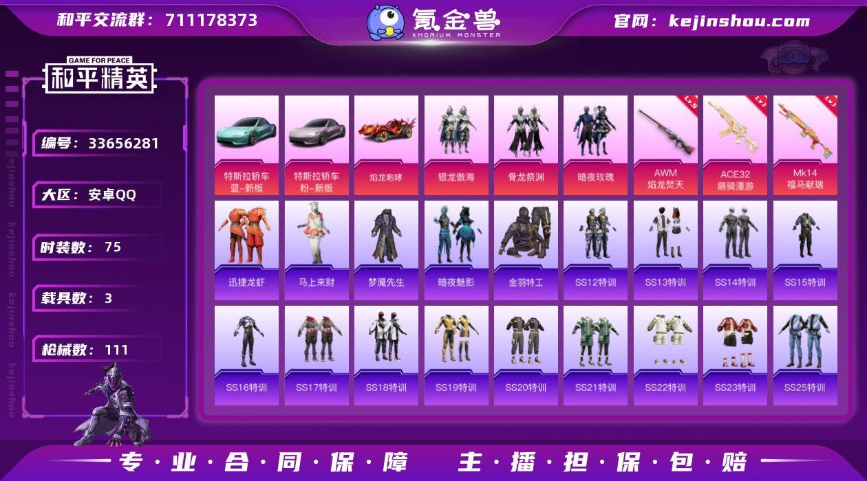 【LHPD715】【特价出售/店主推荐】安卓 手Q-3粉装-3特效枪-3载具-1粉色飞行器-36133热力值-4王牌印记-75套装-111枪皮 【热门品类】:套装-金羽特工 【粉色套装】:粉装-银龙傲海,粉装-骨龙祭渊,粉装-暗夜玫瑰 【粉色枪皮等级】:ACE32-萌骑漫游(一级),AWM-焰龙焚天(五级),Mk14-福马献瑞(一级) 【粉色载具】:特斯拉Roadster(水滴蓝),特斯拉Roadster(沁心粉),焰龙咆哮 【粉色枪皮】:ACE32-萌骑漫游,AWM-焰龙焚天,Mk14-福马献瑞 【粉色飞行器】:焰龙焚天飞行器