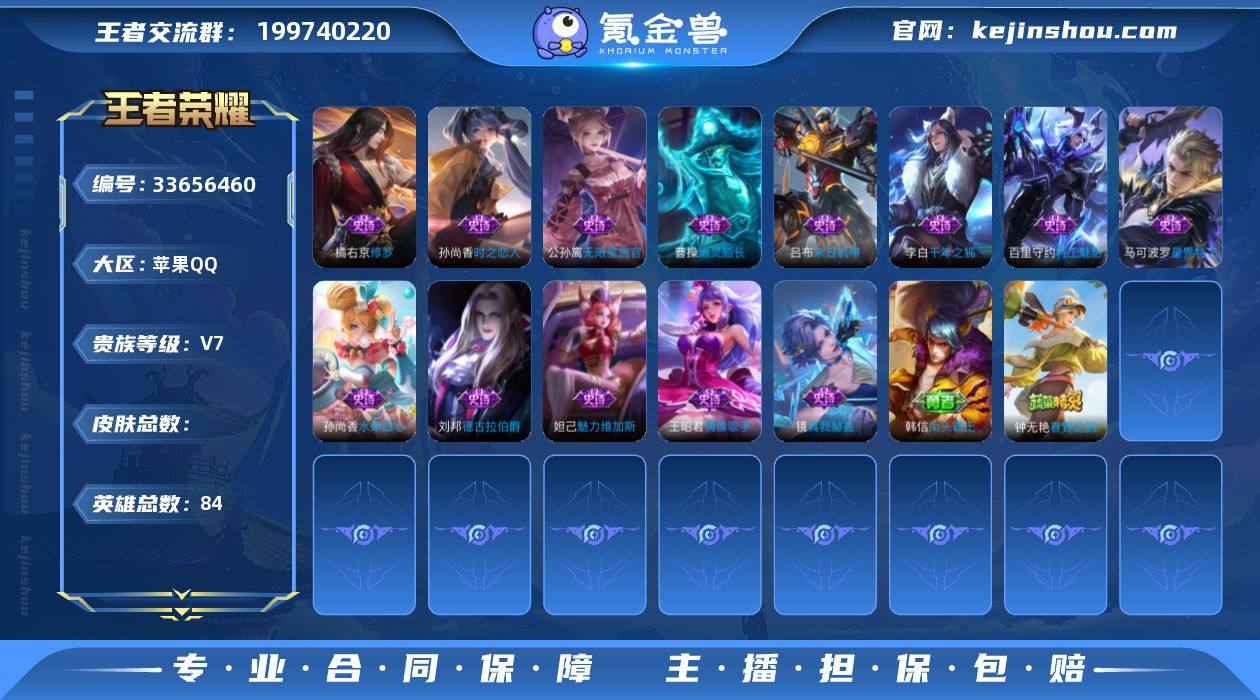 苹果QQ/最强王者/69皮肤/84英雄/0典藏/0珍品无双/1无双/1珍品传说/7传说/23史诗/5稀有英雄