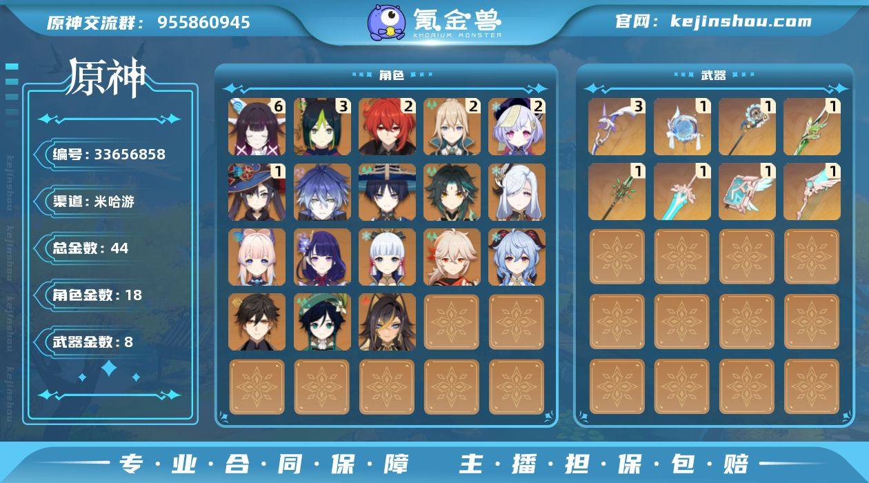 60级/44黄/女主/18个五星角色/8个五星武器 0命迪希雅,0命流浪者,3命提纳里,0命申鹤,0命雷电将军,0命枫原万叶,0命神里绫华,0命钟离,0命甘雨,0命魈,0命温迪,0命珊瑚宫心海,2命七七,2命琴,1命莫娜,2命迪卢克,0命菲林斯,满命哥伦比娅,精1裁叶萃光,精1和璞鸢,精1天空之翼,精3阿莫斯之弓,精1天空之卷,精1天空之傲,精1支离轮光,精1帷间夜曲