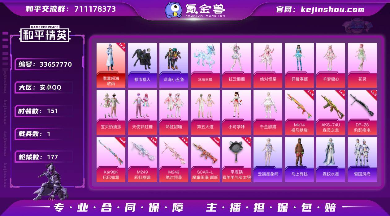 安卓 手Q-1神装-11粉装-8特效枪-1载具-6粉色飞行器-61095热力值-11王牌印记-151套装-177枪皮 【红色神装等级】:魔童闹海-敖丙(三级) 【红色角色神装】:魔童闹海-敖丙 【热门品类】:套装-都市猎人,套装-深海小丑鱼,套装-小丑鱼,套装-龟仙人 【粉色套装】:角色-绝对恒星,粉装-宝贝奶油派,粉装-天使彩虹糖,粉装-彩虹甜喵,粉装-第五大道,角色-小可学妹,角色-千金淑猫,角色-花灵,角色-羊梦糖心,角色-异瞳寒姬,角色-虹云熊熊 【粉色枪皮等级】:SCAR-L-魔童闹海 哪吒(三级),AKS-74U-森灵之息(五级),Kar98K-巳巳如意(五级),Mk14-福马献瑞(五级),M249-彩虹甜喵(四级),M249-绝对恒星(三级),DP-28-豹影疾电(五级),平底锅-喜羊羊与灰太狼(三级) 【粉色载具】:冰绡玉鳞 【粉色枪皮】:SCAR-L-魔童闹海 哪吒,AKS-74U-森灵之息,Kar98K-巳巳如意,Mk14-福马献瑞,M249-彩虹甜喵,M249-绝对恒星,DP-28-豹影疾电,平底锅-喜羊羊与灰太狼 【粉色飞行器】:绝对恒星飞行器,炫彩糖果飞行器,飞天猪飞行器,灵珠游龙飞行器,极意拳锋飞行器,暮色之舞飞行器 【粉色降落伞】:绝对恒星降落伞,甜心宝贝降落伞,暗夜玫瑰降落伞,洛神天依降落伞,彩虹甜喵降落伞,莲影清...