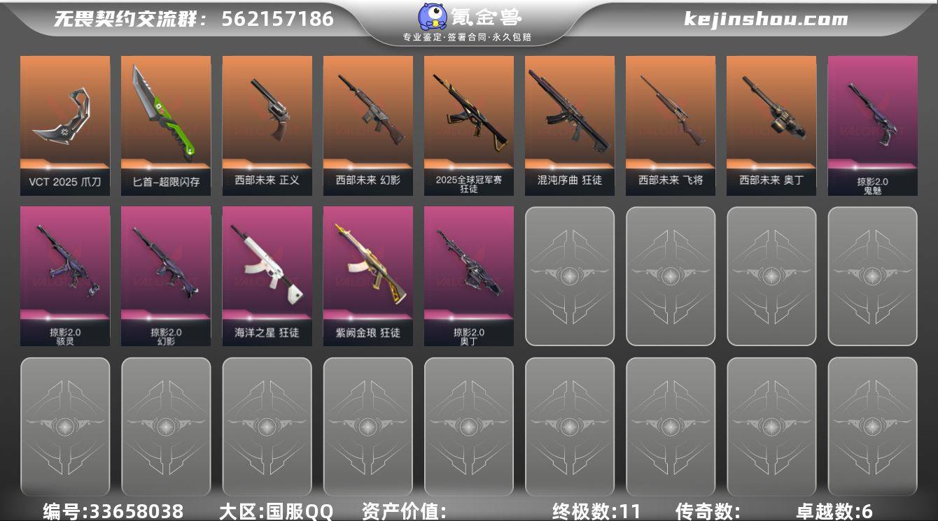 【套装】:VCT 2025 赛季套装,西部未来套装,掠影//2.0套装 【英雄】:幻棱,炼狱,维斯,暮蝶,钛狐,壹决,铁臂,捷风,雷兹,幽影,不死鸟,贤者,猎枭,蝰蛇,零,芮娜,奇乐,尚勃勒,霓虹,斯凯,夜露,星礈,K/O,海神,盖可,黑梦,钢锁 【近战武器】:近战武器-影钩,近战武器-VCT 2025 爪刀,近战武器-未来开拓者,近战武器-超限闪存 匕首,近战武器-圣石匕首 【狂徒】:狂徒-2025全球冠军赛,狂徒-混沌序曲,狂徒-海洋之星,狂徒-紫阙金琅 【幻影】:幻影-西部未来,幻影-掠影//2.0,幻影-超限闪存,幻影-西部未来 【戍卫】:戍卫-浮光跃金 【獠犬】:獠犬-模拟赫兹 【冥驹】:冥驹-模拟赫兹 【飞将】:飞将-西部未来 【莽侠】:莽侠-超限闪存 【战神】:战神-浮光跃金 【奥丁】:奥丁-西部未来,奥丁-掠影//2.0 【雄鹿】:雄鹿-模拟赫兹 【骇灵】:骇灵-掠影//2.0,骇灵-浮光跃金 【蜂刺】:蜂刺-超限闪存 【标配】:标配-超能偶像,标配-浮光跃金 【正义】:正义-西部未来,正义-超限闪存,正义-纳米打击 【鬼魅】:鬼魅-掠影//2.0,鬼魅-模拟赫兹,鬼魅-星云暗涌 【卡面】:终章:激斗汉堡 卡面,进入射程 卡面,《双城之战》拥抱 卡面,精灵大战 卡面,欢迎来...