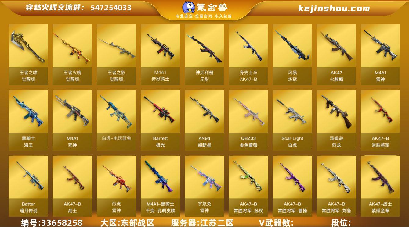 东部江苏二区/可二次可排位/27v/Scar Light-白虎/QBZ03-金色蔷薇/白虎-电玩蓝兔/M4A1-雷神/雷神-烈虎皮肤+雷神-宇航兔兔/EVO III-赤血龙魂/死亡之眼-庆典-CFS 2021/6烈龙+迷你生化手雷/王者火魄+王者之影+王者之啸/G36C-宇航兔兔/COP独角兽+柯尔特雷唤苍龙+柯尔特卡通+柯尔特玫瑰+柯尔特萌杀+USP小动物/猫猫手套+胡萝卜匕首/三防莎莎可拓展四防/详情看图