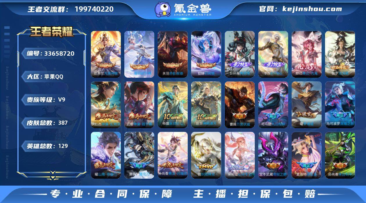 0BFHIQ无二次387皮肤无双3水晶4珍品传说1传说43优质限定45 信用分合格 钱包无法注销 水晶皮肤:赤影疾锋,九霄神辉,幻阙歌,最初的交响, 无双皮肤:碎月剑心,青丘·九尾,离恨烟, 珍品传说皮肤:沧流箭, 新传说限定:九山相柳,李逍遥,神骥·越千峰,神骥·赴朔漠, 传说限定:吕布曦玄引,夏侯惇霜北刀,武圣,挚爱之约,浮生妄,前尘镜,齐天大圣,星穹之声,鹤羽星尊,乘龙·问璇玑,深海之息,妄想实况,无尽星芒,朵莉亚心动手记,燃星之曲,启示之音,山海·苍雷引,神树通天,启明星使, 新传说皮肤:万灵伏威, 传说皮肤:怒海麟威,一念神魔,霜月吟,乞巧织情,末日机甲-孙尚香,黄金射手座,云霓雀翎,灼幽烈阳,冠军飞将,胖达荣荣,末日机甲-孙策,淬星耀世,地狱之眼,诗剑行,炽阳神光,猫影幻舞,久胜战神,超时空战士-狄仁杰,鸣野蒿, 新史诗限定:罗小黑战记-百里玄策,万灵启世,百晓客,
