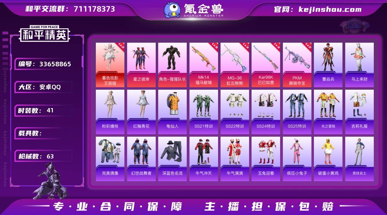 无二次-安卓 手Q-1神装-2粉装-4特效枪-0载具-1粉色飞行器-19438热力值-4王牌印记-41套装-63枪皮HZ2641903 【红色神装等级】:暮色玫影-艾丽娅(二级) 【红色角色神装】:暮色玫影-艾丽娅 【热门品类】:套装-龟仙人 【粉色套装】:粉装-星之彼岸,角色-猩猩队长 【粉色枪皮等级】:Kar98K-巳巳如意(三级),Mk14-福马献瑞(五级),PKM-萌骑夺宝(二级),MG-36-虹云熊熊(三级) 【粉色枪皮】:Kar98K-巳巳如意,Mk14-福马献瑞,PKM-萌骑夺宝,MG-36-虹云熊熊 【粉色飞行器】:太空嘟嘟飞行器 【粉色降落伞】:垂柳戏鸭降落伞,辉云木星降落伞,虎痴许褚降落伞 【稀有套装】:套装-龟仙人,套装-马上来财,套装-粉彩缠枝,套装-雨过天青,套装-红釉青花,角色-曹焱兵 【稀有枪皮】:AKM-破晓战魂,M16A4-幻世战舞者,SCAR-L-炫彩节奏,SCAR-L-玉兔迎春,M416-糯团青竹,M416-红色方程式,AUG-耀粉歌者,QBZ-彩虹符号,M762-天降萌叽,M762-彩虹符号,AC-VAL-天降萌叽,蜜獾-垂柳戏鸭,蜜獾-天降萌叽,蜜獾-娇憨猪猪,UZI-娇憨猪猪,UMP45-夜灯,Vector-生命誓言,汤姆逊-像素花束,Kar98K-彩虹符号,Kar98K-王子的夏天,SKS-炫彩节奏,VSS-星之彼岸,Mini14-旋转彩虹,SLR-娇憨猪猪,...
