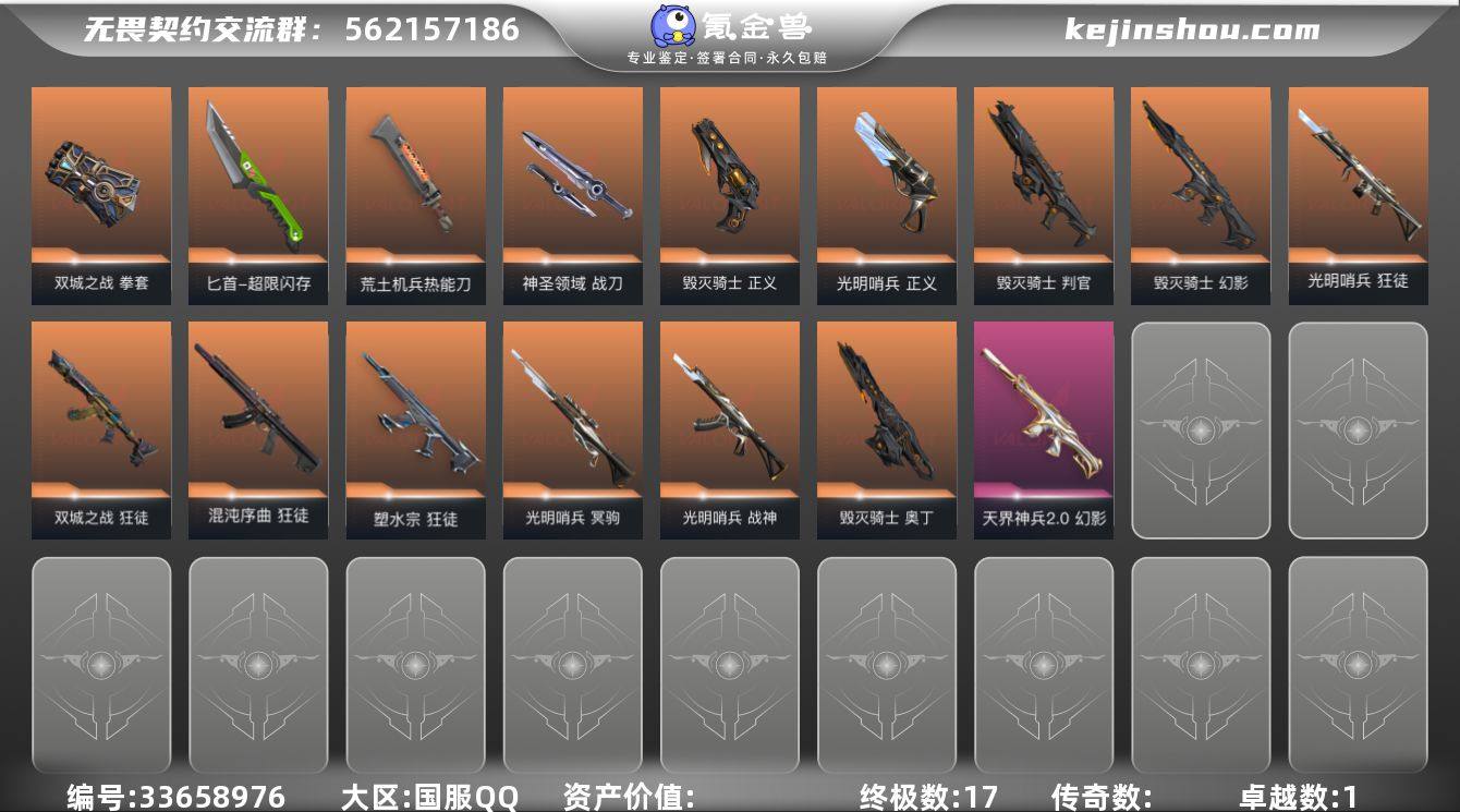 【套装】:《双城之战》收藏套装,光明哨兵套装,毁灭骑士套装 【英雄】:炼狱,维斯,暮蝶,钛狐,壹决,铁臂,捷风,雷兹,不死鸟,贤者,猎枭,零,芮娜,奇乐,尚勃勒,霓虹,斯凯,盖可,黑梦,钢锁 【近战武器】:近战武器-双城之战 拳套,近战武器-超限闪存 匕首,近战武器-荒土机兵 热能刀,近战武器-毁灭战斧,近战武器-圣石遗物,近战武器-神圣领域 战刀 【狂徒】:狂徒-光明哨兵,狂徒-混沌序曲,狂徒-双城之战,狂徒-塑水宗,狂徒-荒土机兵 【幻影】:幻影-毁灭骑士,幻影-天界神兵//2.0,幻影-超限闪存,幻影-神圣领域,幻影-纳米打击 【戍卫】:戍卫-浮光跃金,戍卫-逆冲蛮牛,戍卫-月球哨兵 【獠犬】:獠犬-神圣领域,獠犬-模拟赫兹,獠犬-逆冲蛮牛 【冥驹】:冥驹-光明哨兵,冥驹-荒土机兵,冥驹-模拟赫兹,冥驹-星云暗涌 【莽侠】:莽侠-超限闪存,莽侠-月球哨兵 【战神】:战神-光明哨兵,战神-神圣领域,战神-浮光跃金 【奥丁】:奥丁-毁灭骑士,奥丁-纳米打击 【判官】:判官-毁灭骑士,判官-纳米打击x 【雄鹿】:雄鹿-模拟赫兹,雄鹿-逆冲蛮牛,雄鹿-月球哨兵 【骇灵】:骇灵-荒土机兵,骇灵-浮光跃金,骇灵-星云暗涌 【蜂刺】:蜂刺-超限闪存,蜂刺-星...