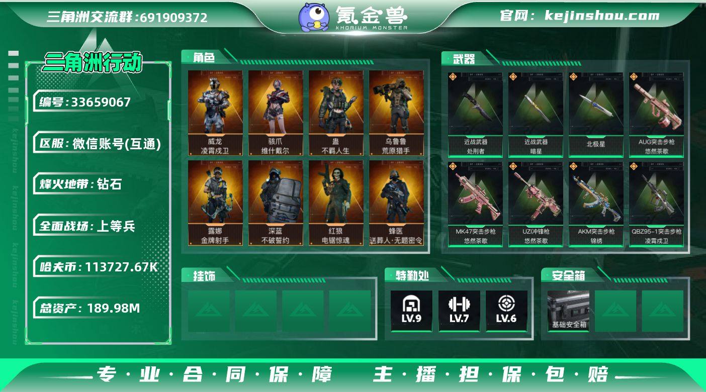 实名: 不可修改 烽火地带段位: 钻石 全面战场段位: 上等兵 总资产: 189984681 哈夫币: 113727671 干员外观: 蜂医-送葬人·无题密令(S5),深蓝-不破誓约(S6),骇爪-维什戴尔,红狼-电锯惊魂,露娜-金牌射手(S7),乌鲁鲁-荒原猎手,威龙-凌霄戍卫,蛊-不羁人生 传说武器皮肤: 近战-北极星,K437突击步枪-北极星,QCQ171冲锋枪-北极星,725双管霰弹枪-送葬人-无题密令,M4A1突击步枪-阿米娅,CAR-15突击步枪-阿米娅,复合弓-黑-天际线,AWM狙击步枪-捞点薯条,腾龙突击步枪-捞点薯条,93R-捞点薯条,AK-12突击步枪-特斯拉线圈,SR-3M紧凑突击步枪-特斯拉线圈,UZI冲锋枪-特斯拉线圈,勇士冲锋枪-能天使-午夜邮差,R93狙击步枪-维什戴尔,SCAR-H战斗步枪-启航,ASh-12战斗步枪-鹅鸭杀,QCQ171冲锋枪-鹅鸭杀,QJB201轻机枪-鹅鸭杀,G3战斗步枪-骑士,KC17突击步枪-电锯惊魂,SG552突击步枪-运动员,近战-暗星,MK47突击步枪-暗星,SR-3M紧凑突击步枪-暗星,近战-处刑者,QBZ95-1突击步枪-凌霄戍卫,K416突击步枪-行动记录,.357左轮-缄花,SR-25射手步枪-缄花,M14射手步枪-缄花,AKM突击步枪-锦绣,MK47突击步枪-悠然茶歇,AUG突击步枪-悠然茶歇,UZI冲锋枪-悠然茶歇 史诗武器皮肤: SVD狙击步枪-阿萨拉工艺,QBZ95-1突击步枪-...