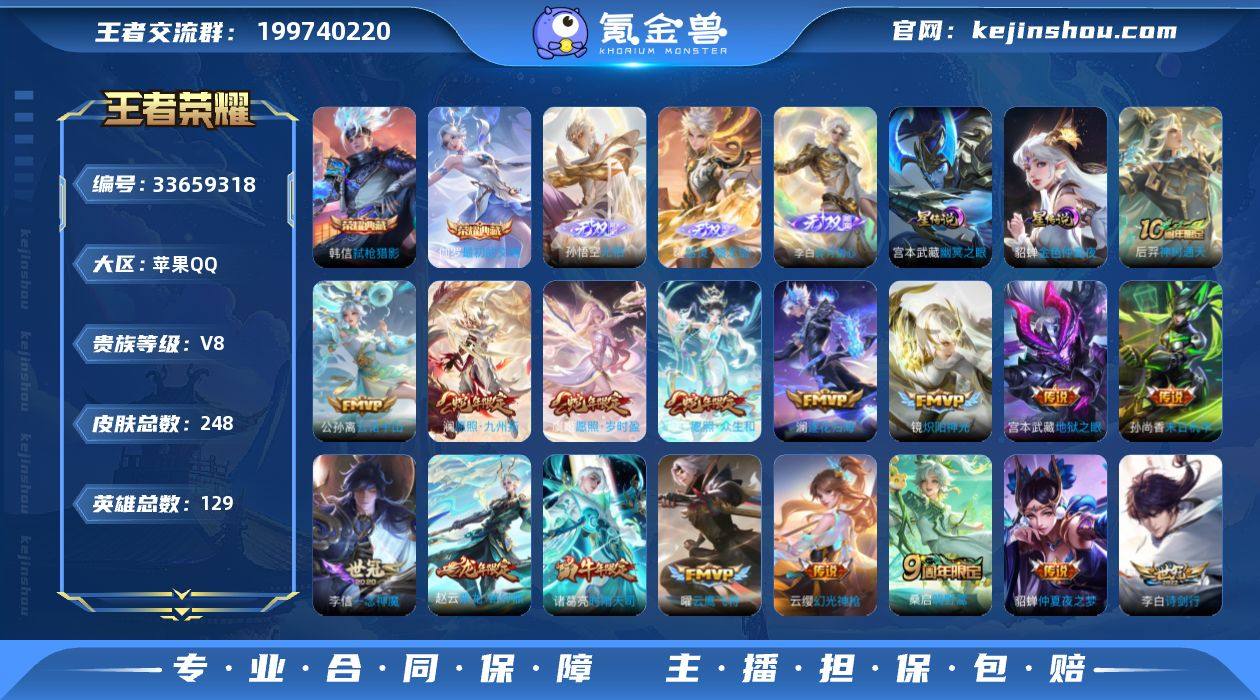 苹果Q-V8-永恒钻石IV段位-129英雄-248皮肤-2典藏皮肤-3无双-1珍品传说-29传说-67史诗【英雄全皮】:敖隐全皮【荣耀典藏】:韩信弑枪猎影,伽罗最初的交响【无双皮肤】:孙悟空无相,曜器灵螭龙剑,李白碎月剑心【珍品传说】:伽罗沧流箭【传说皮肤】:貂蝉神骥聚万邦,后羿神树通天,公孙离云诺千山,妲己愿照众生和,澜愿照九州拓,虞姬愿照岁时盈,云缨幻光神枪,桑启鸣野蒿,赵云乘龙铭钟鼎,澜逐花归海,宫本武藏惊梅引,李白诗剑行,孙策末日机甲,赵云淬星耀世,王昭君乞巧织情,小乔音你心动,诸葛亮时雨天司,铠绛天战甲,镜炽阳神光,虞姬启明星使,曜云鹰飞将,李信一念神魔,貂蝉猫影幻舞,后羿黄金射手座,貂蝉仲夏夜之梦,孙尚香末日机甲,宫本武藏地狱之眼,孙悟空地狱火,狄仁杰超时空战士【限定皮肤】:白起狰,蒙犽顽岩魄,姜子牙天穹之誓,狄仁杰阴阳师,虞姬凯尔特女王,赵云皇家上将,赵云龙胆,孙尚香蔷薇恋人,庄周高山流水,芈月重明,夏侯惇朔风刀,甄姬游园惊梦,曹操烛龙,典韦穷奇,马可波罗山海玄木吟,狄仁杰魔术师,狄仁杰万华元夜,达摩沙漠行僧,项羽海滩派对,老夫子醍醐杖,程咬金演武夺筹,兰陵王金庭之子,孙悟空至尊宝,李元芳云中旅人...