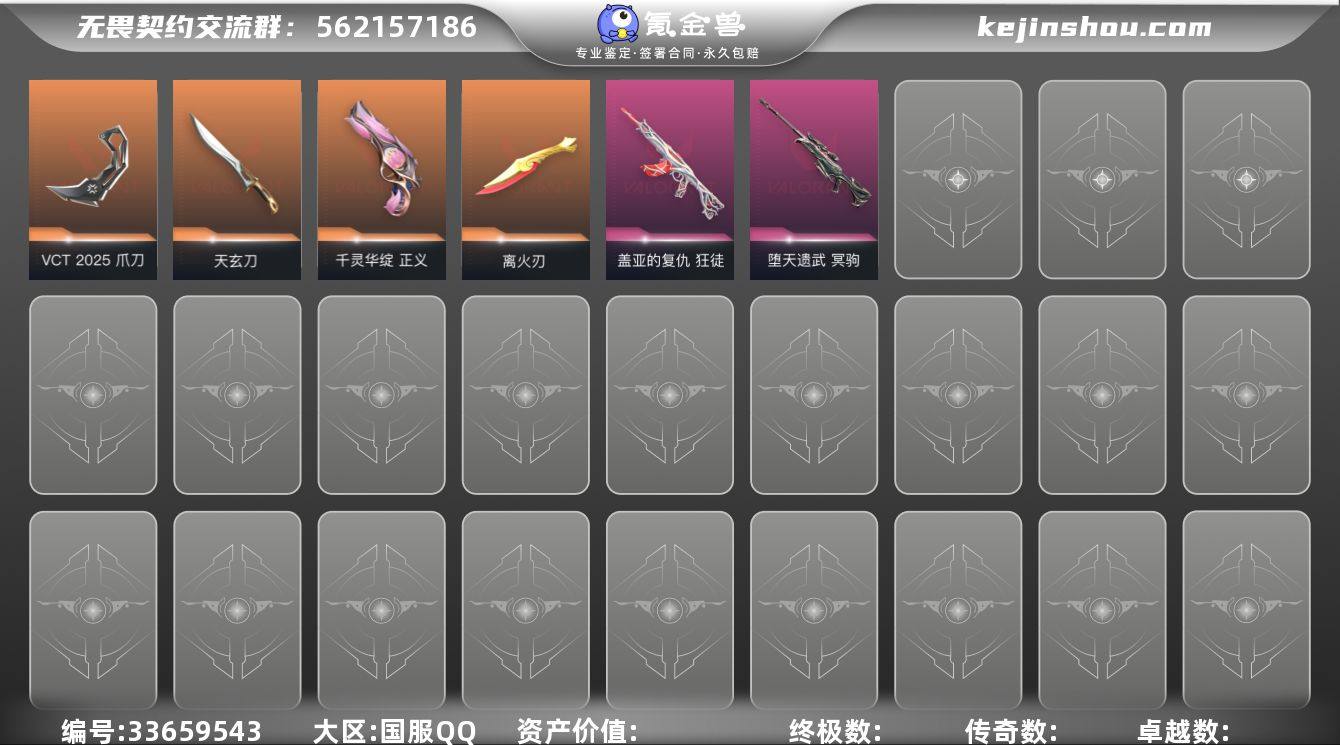 国服Q区 可二次 皮肤价值16590【5橙皮 0金皮 3紫皮 18皮肤 22英雄 102卡面 435已用源晶】未定级 优质皮肤:离火刃套装、VCT 2025 爪刀、狂徒-盖亚的复仇、正义-千灵华绽 【套装】:离火刃套装,VCT 2025 赛季套装,离火刃套装 【英雄】:幻棱,炼狱,维斯,暮蝶,钛狐,壹决,铁臂,捷风,雷兹,不死鸟,贤者,猎枭,零,芮娜,奇乐,尚勃勒,霓虹,夜露,盖可,黑梦,钢锁 【近战武器】:近战武器-VCT 2025 爪刀,近战武器-离火刃,近战武器-天玄刀 【狂徒】:狂徒-光荣异象,狂徒-盖亚的复仇 【冥驹】:冥驹-堕天遗武 【标配】:标配-海洋之星//2.0 【正义】:正义-千灵华绽,正义-复古浪潮,正义-纳米打击 【鬼魅】:鬼魅-流星兵团,鬼魅-光导纤维,鬼魅-数码咒术,鬼魅-星云暗涌 【卡面】:终章:激斗汉堡 卡面,进入射程 卡面,《双城之战》拥抱 卡面,精灵大战 卡面,欢迎来到底城 卡面,南瓜盛典 卡面,修车达人 卡面,正义的化身 卡面,红鳞松叶 卡面,霓帧牛蛙 卡面,梦幻奶茶 卡面,终章:打造专属狂徒 卡面,趁热吃 卡面,哨卫者之领域 卡面,源能反应 卡面,零点嗅探设计图 卡面,终章:瓦娃脸雪糕 卡面,表象之下 卡面,沙雕爆能器 卡面,无畏契约GO!第一卷:芮...