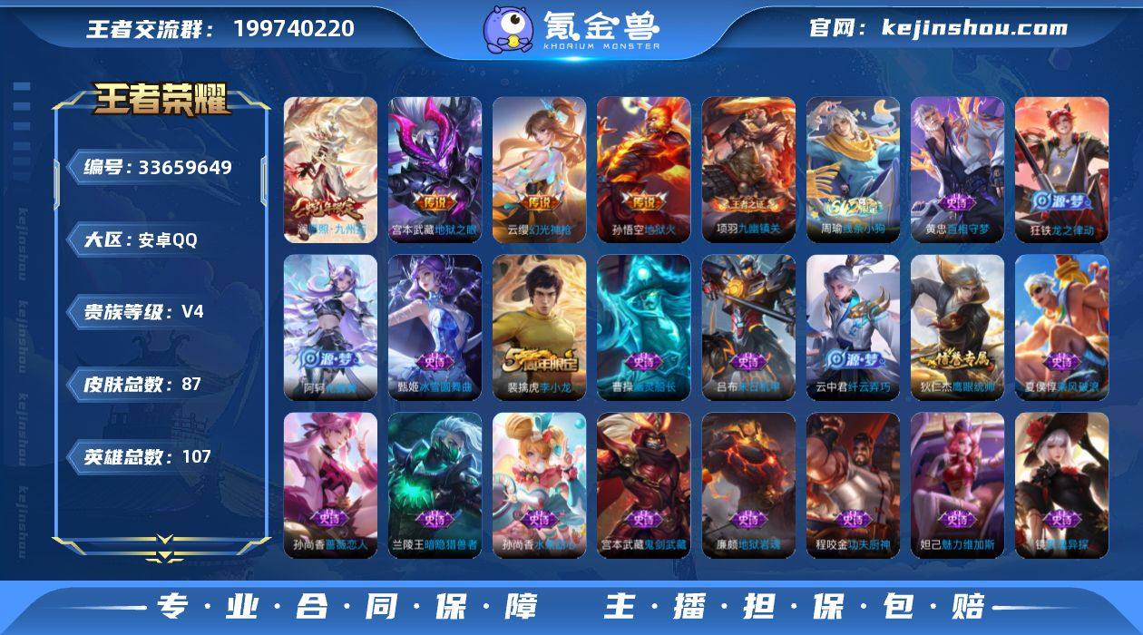 安卓Q-V4-永恒钻石II段位-107英雄-87皮肤-5传说-20史诗【英雄全皮】:孙权全皮【传说皮肤】:马超神骥逐星野,澜愿照九州拓,云缨幻光神枪,宫本武藏地狱之眼,孙悟空地狱火【限定皮肤】:狄仁杰阴阳师,孙尚香蔷薇恋人,项羽海滩派对,百里玄策原初追逐者,裴擒虎李小龙,裴擒虎擒涛扼浪,云中君纤云弄巧,鲁班大师探海日志,桑启海盐诗旅,张良古海寻踪,鬼谷子天穹祈灯,刘邦剑破天穹,程咬金群星魔术团,周瑜熔金海岸【年限皮肤】:澜愿照九州拓【赛季限定】:桑启海盐诗旅,裴擒虎擒涛扼浪,鲁班大师探海日志,张良古海寻踪,鬼谷子天穹祈灯,刘邦剑破天穹,太乙真人谧流熔炉,钟馗虚灵犬护,甄姬逆浪荇歌,亚瑟荣光之誓,百里玄策原初追逐者,项羽九幽镇关【战令限定】:周瑜线条小狗【史诗皮肤】:周瑜线条小狗,项羽九幽镇关,黄忠百相守梦,狂铁龙之律动,阿轲化蝶舞,镜玫瑰异探,云中君纤云弄巧,裴擒虎李小龙,百里玄策原初追逐者,狄仁杰鹰眼统帅,程咬金功夫厨神,兰陵王暗隐猎兽者,夏侯惇乘风破浪,吕布末日机甲,曹操幽灵船长,妲己魅力维加斯,孙尚香水果甜心,孙尚香蔷薇恋人,宫本武藏鬼剑武藏,廉颇地狱岩魂,甄姬冰雪圆舞曲【其他皮肤】:影百相守梦,...