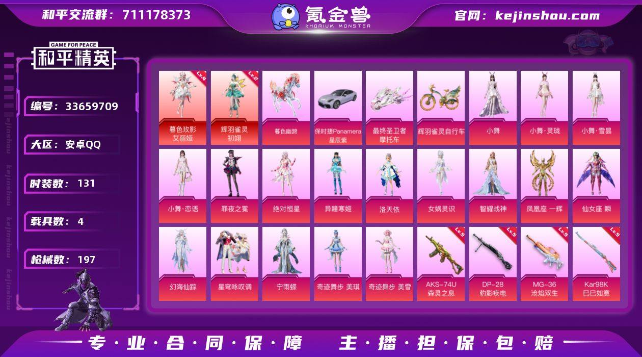安卓 手Q-2神装-17粉装-18特效枪-4载具-17粉色飞行器-78174热力值-5王牌印记-131套装-197枪皮 【红色神装等级】:暮色玫影-艾丽娅(四级),辉羽雀灵-初翊(二级) 【红色角色神装】:暮色玫影-艾丽娅,辉羽雀灵-初翊 【粉色套装】:角色-绝对恒星,角色-洛天依,角色-女娲灵识,角色-智耀战神,角色-凤凰座 一辉,角色-仙女座 瞬,角色-幻海仙踪,粉装-星穹咏叹调,角色-宁雨蝶,角色-奇迹舞步 美琪,角色-奇迹舞步 美雪,角色-异瞳寒姬,角色-罪夜之冕,人物-小舞,人物-小舞·灵珑,人物-小舞·雪昙,人物-小舞·恋语 【粉色枪皮等级】:AKM-幻海仙踪(一级),AKM-暮色玫影(三级),SCAR-L-魔童闹海 哪吒(三级),AUG-星梦奇缘(三级),蜜獾-异瞳寒姬(二级),AKS-74U-星穹咏叹调(三级),AKS-74U-森灵之息(五级),Kar98K-巳巳如意(五级),MK12-雪月幻音(四级),M249-绝对恒星(三级),DP-28-豹影疾电(五级),MG3-辉羽雀灵(三级),MG-36-幻彩电音(二级),MG-36-沧焰双生(五级) 【粉色载具】:保时捷Panamera(星辰紫),最终圣卫者摩托车,暮色幽蹄,辉羽雀灵自行车 【粉色枪皮】:AKM-幻海仙踪,AKM-暮色玫影,SCAR-L-魔童闹海 哪吒,AUG-星梦奇缘,蜜獾-异瞳寒姬,UMP45-萌骑冒险,AKS-...