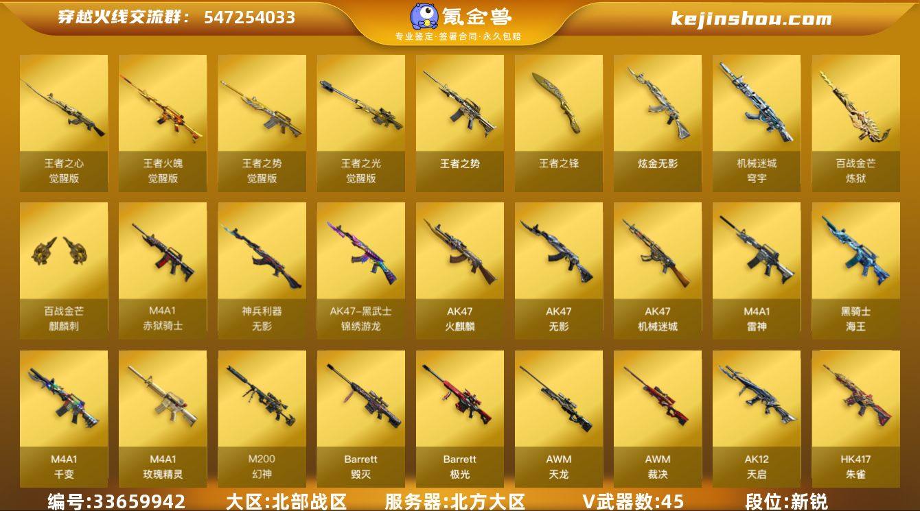 【ky7076】北方大区-51V-9王者武器数-1炫金武器数 【热门武器】:HK417-朱雀,M200-幻神,死亡之眼,汤姆逊-烈龙,火麒麟-绝迹,COP-白鲨,沙鹰-修罗*2 【王者炫金武器】:王者之势*2,王者之锋,王者之魄高爆手雷,王者之魄闪光弹,炫金无影 【音效卡】:Barrett-毁灭音效卡,炼狱-百战金芒-庆典舞曲音效卡 【皮肤】:雷神-暗月,M4A1-再燃火线,毁灭-暗月,死神-秘银*3,战神-粉色甜心皮肤,极光-能量核心*2,修罗-能量核心*4,轻型军用手斧-再燃火线 【角色】:樱,零·纪元,战地猎狐,王者-瞳-闭月羞花,奇洋探员,乔伊教练,修道士,云海玲珑,葵-阿尔法武装,暗夜-X,初恋灵狐,疾风,娟娟,曼陀罗-X,潘多拉-X,斯沃特-X,维纳斯,夜玫瑰-宠粉 【人偶武器】:火麒麟-绝迹,COP-白鲨,AWM-灵狐-15周年嘉年华,COP-旗袍,生化手雷-机甲核心 【暴走生化】:死亡之眼,超级对讲机 【挑战大师】:冰龙粉碎者-白马银枪,激光毁灭者III-白马银枪*3,神圣爆裂者-末日III 【英雄级武器】:M4A1-千变,AK47-火麒麟,M4A1-雷神,AK47-无影,AK12-天启*2,AK47-机械迷城,HK417-朱雀,无影-神兵利器,黑武士-锦绣游龙,M4A1-玫瑰精灵,王者之心-觉醒版,王者之势-觉醒版,王者火魄-...