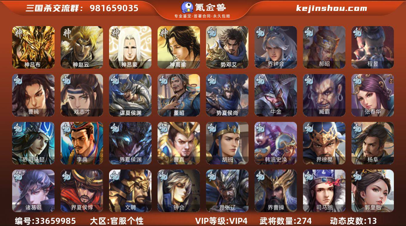 官阶:骠骑将军 VIP等级:VIP4级 史诗武将数:21 动态皮肤数:13 武将总数:274 史诗宝珠数:2 元宝数:3228 将魂数:5012 神吕布,神赵云,界钟会,郝昭,曹纯,戏志才,程昱,势邓艾,马云騄,谋赵云,谋马超,沙摩柯,谯周,界徐盛,势太史慈,左慈,张琪瑛,星甘宁,杜预,谋张角,兀突骨,神吕蒙,神周瑜,势夏侯尚,SP关羽,乐进,曹昂,诸葛诞,朱灵,文聘,SP姜维,张春华,钟会,曹冲,郭淮,满宠,界王异,界曹操,界司马懿,界夏侯惇,界张辽,界许褚,界郭嘉,李典,曹真,韩浩史涣,陈群,曹叡,钟繇,司马朗,李通,郭皇后,辛宪英,吕虔,界荀彧,界徐晃,界曹丕,界曹植,蔡贞姬,袁涣,崔琰,毛玠,杨阜,阮慧,谋于禁,胡班,谋夏侯渊,牛金,界夏侯渊,臧霸,唐咨,董昭,势陈到,SP孙尚香,关银屏,夏侯霸,马良,关兴张苞,廖化,界马岱,关平,刘封,界法正,界关兴张苞,界刘备,界关羽,界赵云,SP徐庶,吴懿,周仓,张松,夏侯氏,糜竺,马忠,李严,黄皓,界黄月英,赵统赵广,严颜,界伊籍,邓芝,界简雍,费祎,王甫赵累,界周仓,刘巴,彭羕,谋庞统,谋张飞,霍峻,诸葛果,蒋琬费祎,糜芳傅士仁,甘夫人,鲁肃,凌操,大乔小乔,诸葛恪,诸葛瑾,孙鲁育,程普,韩当,潘璋马忠,虞翻,界甘宁,界黄盖,界周瑜,界大乔,界陆逊,孙鲁班,朱桓,顾雍,孙休,朱治,全琮,阚泽,孙登,界孙权,吕岱,界...