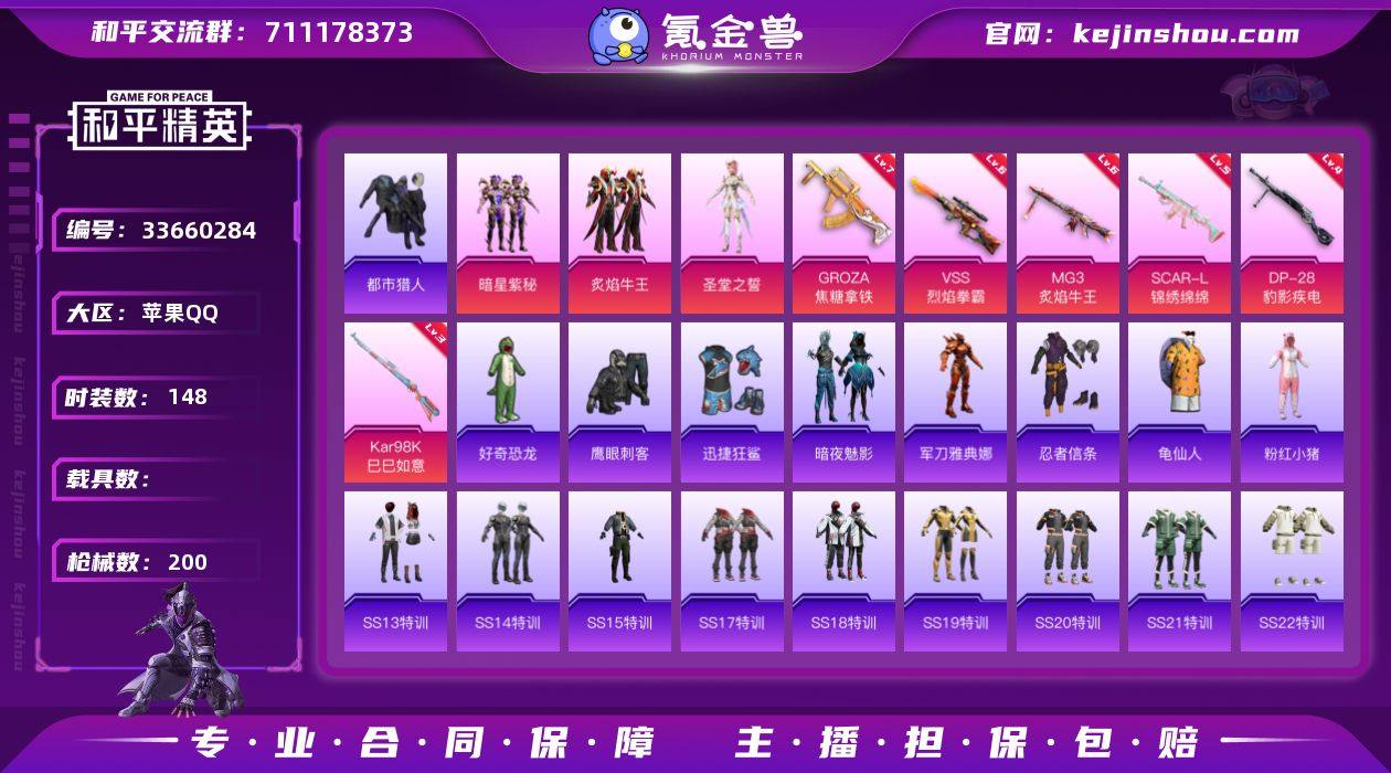 苹果 手Q-3粉装-6特效枪-0载具-2粉色飞行器-60201热力值-1王牌印记-148套装-200枪皮 【热门品类】:套装-都市猎人,角色-军刀雅典娜,套装-忍者信条,套装-龟仙人,套装-粉红小猪 【粉色套装】:粉装-暗星紫秘,粉装-炙焰牛王,角色-圣堂之誓 【粉色枪皮等级】:SCAR-L-锦绣绵绵(五级),GROZA-焦糖拿铁(七级),Kar98K-巳巳如意(三级),VSS-烈焰拳霸(六级),DP-28-豹影疾电(四级),MG3-炙焰牛王(六级) 【粉色枪皮】:SCAR-L-锦绣绵绵,GROZA-焦糖拿铁,Kar98K-巳巳如意,VSS-烈焰拳霸,DP-28-豹影疾电,MG3-炙焰牛王 【粉色飞行器】:齐天大圣飞行器,黄族统领飞行器 【粉色降落伞】:幻影战神降落伞,梦幻火箭降落伞,暗夜玫瑰降落伞,林间仙鹿降落伞,筑梦精灵降落伞,炙焰牛王降落伞,黄族统领降落伞,天星战神降落伞,炎氏战神降落伞 【稀有套装】:套装-龟仙人 【稀有枪皮】:AKM-四圣焕新,AKM-夜灯,AKM-彩虹符号,AKM-影袭,AKM-恐龙拽拽,AKM-灼热熔岩,AKM-王牌投手,AKM-生命誓言,AKM-百万伏特,AKM-破晓战魂,AKM-虎虎生威,AKM-龙的传人,M16A4-幻世战舞者,M16A4-甜心亚梦,M16A4-红色方程式,M16A4-莲影清波,M16A4-蓝色火焰,SCAR-L-炫彩节奏,SCAR-L-玉兔迎...