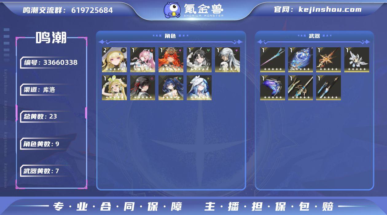 男/女主: 男主 总黄数: 23 联觉等级: 80 拥有五星共鸣者: 鉴心,卡卡罗,维里奈,守岸人,菲比,奥古斯塔,尤诺,千咲,爱弥斯 2鸣五星共鸣者: 2鸣菲比 1鸣五星共鸣者: 1鸣鉴心,1鸣卡卡罗,1鸣维里奈,1鸣奥古斯塔,1鸣爱弥斯 0鸣五星共鸣者: 0鸣守岸人,0鸣尤诺,0鸣千咲 拥有五星武器: 千古洑流,星序协响,和光回唱,血誓盟约,驭冕铸雷之权,万物持存的注释,永远的启明星 1鸣五星武器: 1鸣千古洑流,1鸣星序协响,1鸣和光回唱,1鸣血誓盟约,1鸣驭冕铸雷之权,1鸣万物持存的注释,1鸣永远的启明星 亮点: 【MC357】80级/23黄/男主/9个五星角色/7个五星武器未绑定,爱弥斯,奥古斯塔,尤诺,千咲,菲比,守岸人,维里奈,卡卡罗,鉴心,永远的启明星,万物持存的注释,驭冕铸雷之权,血誓盟约,和光回唱,星序协响,千古洑流,2命菲比,1命爱弥斯,1命奥古斯塔,1命维里奈,1命卡卡罗,1命鉴心,0命尤诺,0命千咲,0命守岸人,精1永远的启明星,精1万物持存的注释,精1驭冕铸雷之权,精1血誓盟约,精1和光回唱,精1星序协响,精1千古洑流