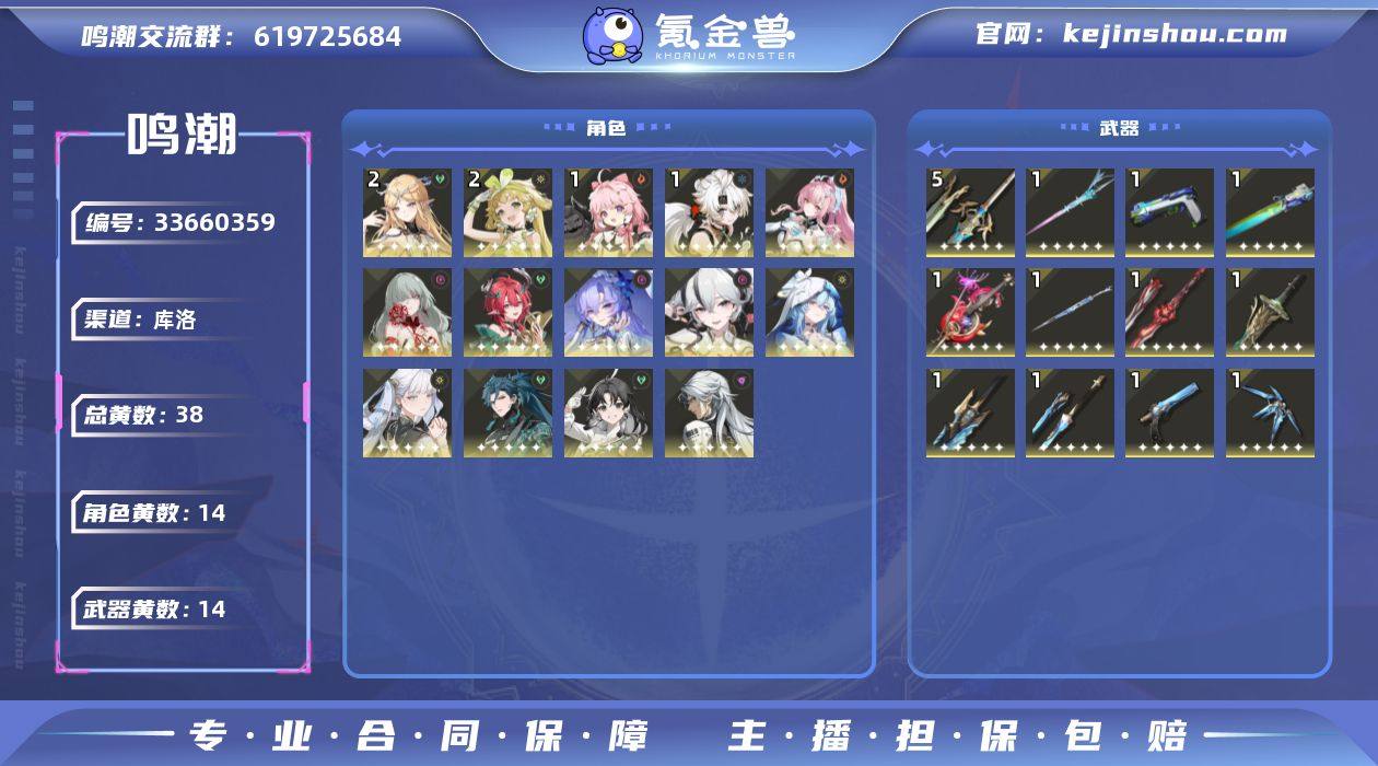 男/女主: 男主 总黄数: 38 联觉等级: 74 拥有五星共鸣者: 忌炎,鉴心,卡卡罗,安可,维里奈,凌阳,今汐,守岸人,椿,坎特蕾拉,夏空,卡提希娅,弗洛洛,爱弥斯 2鸣五星共鸣者: 2鸣维里奈,2鸣卡提希娅 1鸣五星共鸣者: 1鸣安可,1鸣凌阳 0鸣五星共鸣者: 0鸣忌炎,0鸣鉴心,0鸣卡卡罗,0鸣今汐,0鸣守岸人,0鸣椿,0鸣坎特蕾拉,0鸣夏空,0鸣弗洛洛,0鸣爱弥斯 拥有五星武器: 苍鳞千嶂,浩境粼光,千古洑流,停驻之烟,漪澜浮录,裁春,血誓盟约,不屈命定之冠,幽冥的忘忧章,源能机锋,相位涟漪,永远的启明星 5鸣五星武器: 5鸣血誓盟约 1鸣五星武器: 1鸣苍鳞千嶂,1鸣浩境粼光,1鸣千古洑流,1鸣停驻之烟,1鸣漪澜浮录,1鸣裁春,1鸣不屈命定之冠,1鸣幽冥的忘忧章,1鸣相位涟漪,1鸣源能机锋,1鸣永远的启明星 亮点: 【MC359】74级/38黄/男主/14个五星角色/14个五星武器未绑定,爱弥斯,夏空,卡提希娅,弗洛洛,坎特蕾拉,椿,今汐,守岸人,忌炎,维里奈,卡卡罗,鉴心,安可,凌阳,永远的启明星,相位涟漪,源能机锋,幽冥的忘忧章,不屈命定之冠,血誓盟约,裁春,苍鳞千嶂,浩境粼光,千古洑流,停驻之烟,漪澜浮录,2命卡提希娅,2命维里奈,1命安可,1命凌阳,0命爱弥斯,0命夏空,0命弗洛洛,0命坎特蕾拉,0命椿,0命今汐,0命守岸人,0命忌炎,0命卡...