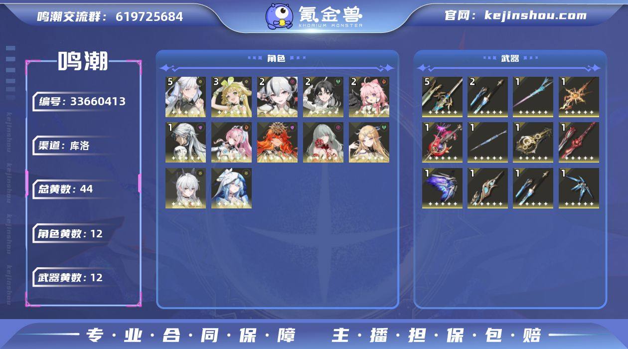 男/女主: 女主 总黄数: 44 联觉等级: 80 拥有五星共鸣者: 鉴心,卡卡罗,安可,维里奈,今汐,守岸人,椿,赞妮,卡提希娅,弗洛洛,奥古斯塔,爱弥斯 5鸣五星共鸣者: 5鸣今汐 3鸣五星共鸣者: 3鸣维里奈 2鸣五星共鸣者: 2鸣鉴心,2鸣安可,2鸣椿 1鸣五星共鸣者: 1鸣卡卡罗 0鸣五星共鸣者: 0鸣守岸人,0鸣赞妮,0鸣卡提希娅,0鸣弗洛洛,0鸣奥古斯塔,0鸣爱弥斯 拥有五星武器: 千古洑流,漪澜浮录,时和岁稔,星序协响,裁春,血誓盟约,焰光裁定,不屈命定之冠,幽冥的忘忧章,驭冕铸雷之权,永远的启明星 5鸣五星武器: 5鸣血誓盟约 2鸣五星武器: 2鸣千古洑流 1鸣五星武器: 1鸣千古洑流,1鸣漪澜浮录,1鸣时和岁稔,1鸣星序协响,1鸣裁春,1鸣焰光裁定,1鸣不屈命定之冠,1鸣幽冥的忘忧章,1鸣驭冕铸雷之权,1鸣永远的启明星 亮点: 【MC361】80级/44黄/女主/12个五星角色/12个五星武器未绑定,爱弥斯,赞妮,卡提希娅,弗洛洛,奥古斯塔,椿,今汐,守岸人,维里奈,卡卡罗,鉴心,安可,永远的启明星,驭冕铸雷之权,幽冥的忘忧章,不屈命定之冠,焰光裁定,血誓盟约,裁春,星序协响,时和岁稔,千古洑流,漪澜浮录,5命今汐,3命维里奈,2命椿,2命鉴心,2命安可,1命卡卡罗,0命爱弥斯,0命赞妮,0命卡提希娅,0命弗洛洛,0命奥古斯塔,0命守岸人,精...