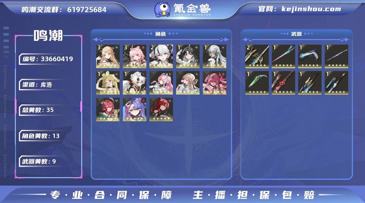 男/女主: 男主 总黄数: 35 联觉等级: 80 拥有五星共鸣者: 鉴心,卡卡罗,安可,维里奈,凌阳,吟霖,椿,洛可可,夏空,卡提希娅,露帕,琳奈,爱弥斯 3鸣五星共鸣者: 3鸣安可,3鸣卡提希娅 2鸣五星共鸣者: 2鸣椿 1鸣五星共鸣者: 1鸣鉴心,1鸣卡卡罗,1鸣维里奈,1鸣凌阳 0鸣五星共鸣者: 0鸣吟霖,0鸣洛可可,0鸣夏空,0鸣露帕,0鸣琳奈,0鸣爱弥斯 拥有五星武器: 浩境粼光,千古洑流,裁春,血誓盟约,林间的咏叹调,不屈命定之冠,相位涟漪,永远的启明星 2鸣五星武器: 2鸣血誓盟约 1鸣五星武器: 1鸣浩境粼光,1鸣千古洑流,1鸣裁春,1鸣林间的咏叹调,1鸣不屈命定之冠,1鸣相位涟漪,1鸣永远的启明星 亮点: 【MC358】80级/35黄/男主/13个五星角色/9个五星武器未绑定,爱弥斯,夏空,卡提希娅,露帕,琳奈,椿,洛可可,吟霖,维里奈,卡卡罗,鉴心,安可,凌阳,永远的启明星,相位涟漪,不屈命定之冠,林间的咏叹调,血誓盟约,裁春,浩境粼光,千古洑流,3命卡提希娅,3命安可,2命椿,1命维里奈,1命卡卡罗,1命鉴心,1命凌阳,0命爱弥斯,0命夏空,0命露帕,0命琳奈,0命洛可可,0命吟霖,精2血誓盟约,精1永远的启明星,精1相位涟漪,精1不屈命定之冠,精1林间的咏叹调,精1裁春,精1浩境粼光,精1千古洑流