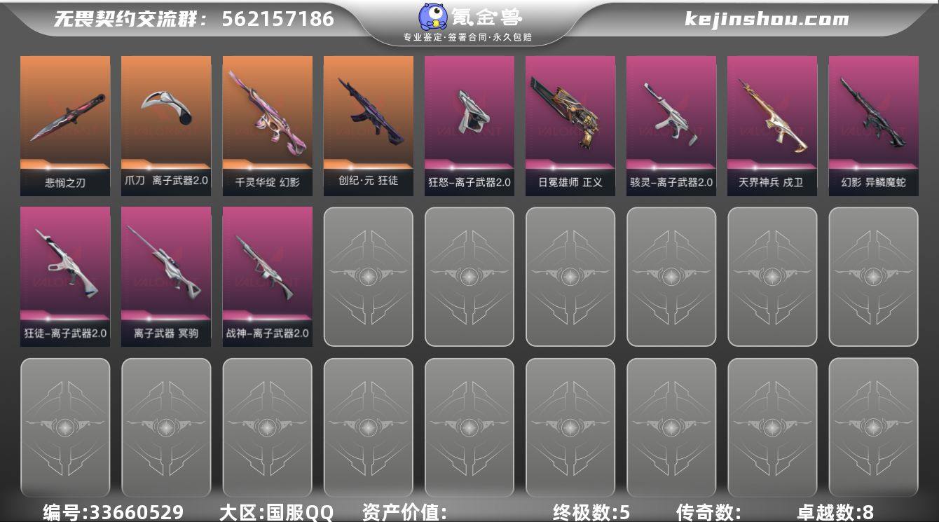 【套装】:无畏契约季前邀请赛套装,离子武器//2.0套装 【英雄】:幻棱,炼狱,维斯,暮蝶,钛狐,壹决,铁臂,捷风,雷兹,幽影,不死鸟,贤者,猎枭,蝰蛇,零,芮娜,奇乐,尚勃勒,霓虹,斯凯,夜露,星礈,K/O,海神,盖可,黑梦,钢锁 【近战武器】:近战武器-蒙太奇 战斧,近战武器-无畏契约季前邀请赛 悲悯之刃,近战武器-离子武器//2.0 爪刀 【狂徒】:狂徒-创·纪元,狂徒-离子武器//2.0 【幻影】:幻影-千灵华绽,幻影-异鳞魔蛇,幻影-蒙太奇 【戍卫】:戍卫-天界神兵 【冥驹】:冥驹-离子武器 【战神】:战神-离子武器//2.0,战神-蒙太奇 【骇灵】:骇灵-离子武器//2.0,骇灵-蒙太奇 【正义】:正义-日冕雄师 【鬼魅】:鬼魅-诡秘蛇影,鬼魅-星云暗涌 【狂怒】:狂怒-离子武器//2.0,狂怒-蒙太奇 【卡面】:南瓜盛典 卡面,归乡 // 蝰蛇 卡面,超能偶像 卡面,生意人麦宝 卡面,树懒大作战 卡面,Clutch 卡面,无畏契约GO!第一卷:芮娜 卡面,无畏契约GO!第一卷:零 卡面,无垠星环 卡面,《双城之战》金克丝 卡面,代号红色 卡面,新兵报到 卡面,V契约 卡面,无畏契约 卡面 【喷漆】:聚合之力 喷漆,买装还是存钱 喷漆,关门放狗 喷漆,暴走萝莉 喷漆,放下武...
