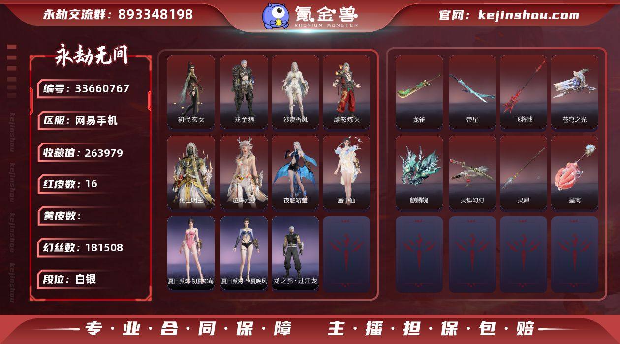 WJ6187,网易手机,可换绑,三人段位白银1,声望14,16红,396金,等级366,收藏值263979,幻丝181508,金砖12,通行证Lv1,变身器,荆魂,西行劫神君印,龙门石龛造像,红色神品,墨离,沙漠香风,夜魅游莹,画中仙,化生明王,初代玄女,戎金狼,熛怒炼火,泣珠龙纱,苍穹之光,麒麟魄,帝星,龙雀,飞将戟,灵犀,灵狐幻刃,角色金色皮肤,封神录申公豹,司天命,禄运玉霄,封神录龙吉公主,赤丹朱湛,枫狩,倾国倾城闭月,倒反阴阳凛冬,千秋匠心玉叶景,浣烟纱,瀚海苍鹰,福瑞天泽,葫芦兄弟蛤蟆头领,街头狂欢不败擂主,观山海秋神蓐收,西行劫悟空,干将莫邪,观山海冬神玄冥,赤阳天狐,封神录妲己,黄昏巫主,绿野守护悠竹萌客,夏日派对初夏绯莓,街头狂欢涂鸦少女,西行劫紫衣仙子,夜绸袍,夏日派对半夏晚风,虹猫蓝兔七侠传虹猫,金财聚辉,封神录姜子牙,云间影,赤焰战灵,绿野守护山漠狞影,雪铃绮歌,九骊之君,八宝龙王,九州遗珍福寿仙,智绘萍之缘,龙之影过江龙,