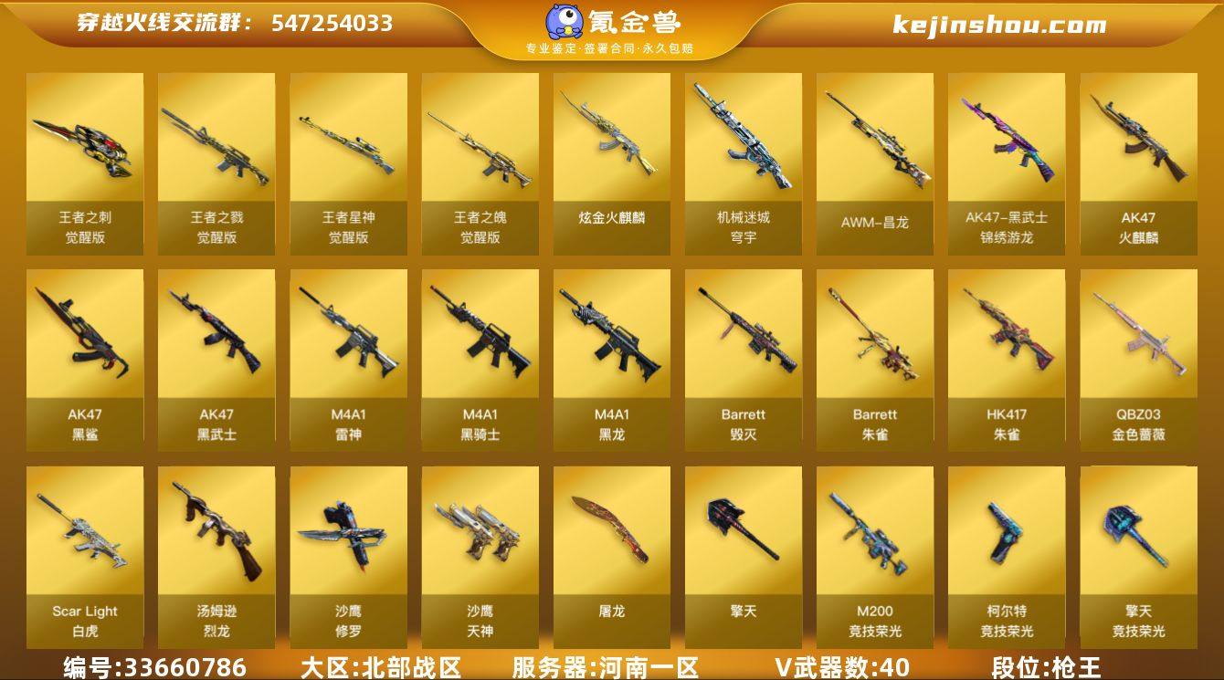 【ky7073】河南一区-48V-5王者武器数-1炫金武器数 【热门武器】:QBZ03-金色蔷薇,Scar Light-白虎,HK417-朱雀,M200-竞技荣光,死亡之眼,M4A1-黑骑士,汤姆逊-烈龙*5,羊驼玩偶,裁决-雪莉杨,USP-雷暴,沙鹰-修罗*3 【王者炫金武器】:炫金火麒麟 【音效卡】:M4A1-黑龙音效卡,M4A1-黑骑士音效卡,AWM-昌龙-怀旧音效卡*2 【皮肤】:雷神-暗月,雷神-荣耀之魄,雷神-航星皮肤,雷神-诺拉 皮肤,炼狱-月 皮肤,火麒麟-轻羽皮肤,毁灭-战神张飞,毁灭-BEAN-2020MVP,毁灭-神秘黑洞皮肤,毁灭-英雄计划 皮肤,黑龙-能量核心,黑骑士-暗月,擎天-蒸汽钟表 皮肤 【角色】:电竞教官-云悠悠,战地猎狐,初恋灵狐,芳心审判者,飞虎队-X,嘉年华灵狐,猎狐者-追月,龙儿,玫瑰花神,潘多拉-甜心教官,蛇姬,蜀雪,兔囡囡,樱-战斗天使,幽,游珑儿,潘多拉-N,团团 【人偶武器】:裁决-雪莉杨,AWM-灵狐-15周年嘉年华,迷你牛牛,迷你生化手雷,生化手雷-机甲核心 【暴走生化】:死亡之眼,超级对讲机 【挑战大师】:激光毁灭者III 【英雄级武器】:AK47-火麒麟,M4A1-黑龙,M4A1-雷神*3,M4A1-黑骑士,AK47-黑武士,AK47-黑鲨,HK417-朱雀,Scar Light-白虎,QBZ03-金色蔷薇,黑...