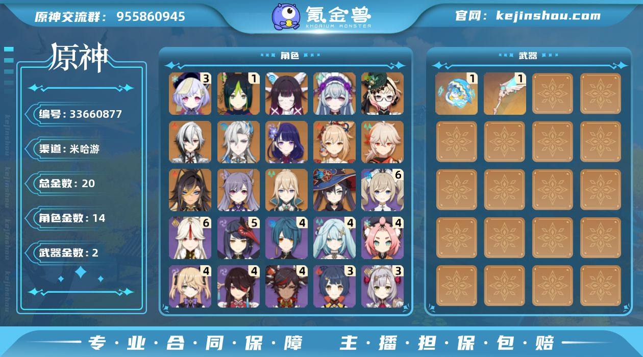 - 官服天空岛,冒险等级55级,可换绑手机 - 五星角色:、万叶、雷神、阿蕾奇诺、那维莱特、宵宫、刻晴、莫娜、七七、琴 - 四星高练:行秋、香菱、班尼特、提纳里、珐露珊等 - 武器:天空之翼、冲浪时光、雷神精3渔获、宵宫精5弓藏、班尼特精5西风剑 - 地图探索度低,大量原石未拿,可自肝 - 无封号记录