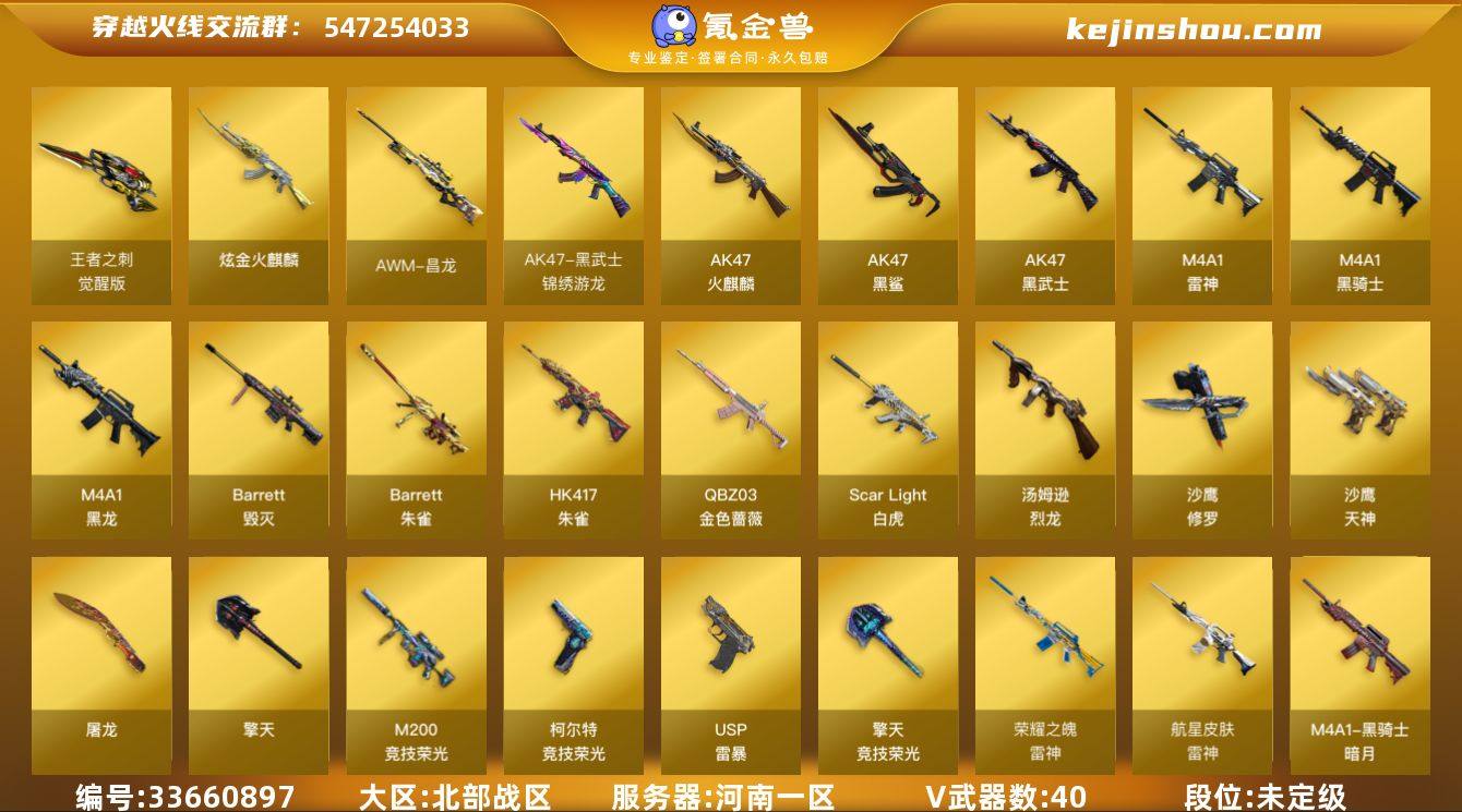 河南一区-48V-5王者武器数-1炫金武器数 【热门武器】:QBZ03-金色蔷薇,Scar Light-白虎,HK417-朱雀,M200-竞技荣光,死亡之眼,M4A1-黑骑士,汤姆逊-烈龙*5,羊驼玩偶,裁决-雪莉杨,USP-雷暴,沙鹰-修罗*3 【王者炫金武器】:炫金火麒麟 【音效卡】:M4A1-黑龙音效卡,M4A1-黑骑士音效卡,AWM-昌龙-怀旧音效卡*2 【皮肤】:雷神-暗月,雷神-荣耀之魄,雷神-航星皮肤,雷神-诺拉 皮肤,炼狱-月 皮肤,火麒麟-轻羽皮肤,毁灭-战神张飞,毁灭-BEAN-2020MVP,毁灭-神秘黑洞皮肤,毁灭-英雄计划 皮肤,黑龙-能量核心,黑骑士-暗月,擎天-蒸汽钟表 皮肤 【角色】:电竞教官-云悠悠,战地猎狐,初恋灵狐,芳心审判者,飞虎队-X,嘉年华灵狐,猎狐者-追月,龙儿,玫瑰花神,潘多拉-甜心教官,蛇姬,蜀雪,兔囡囡,樱-战斗天使,幽,游珑儿,潘多拉-N,团团 【人偶武器】:裁决-雪莉杨,AWM-灵狐-15周年嘉年华,迷你牛牛,迷你生化手雷,生化手雷-机甲核心 【暴走生化】:死亡之眼,超级对讲机 【挑战大师】:激光毁灭者III 【英雄级武器】:AK47-火麒麟,M4A1-黑龙,M4A1-雷神*3,M4A1-黑骑士,AK47-黑武士,AK47-黑鲨,HK417-朱雀,Scar Light-白虎,QBZ03-金色蔷薇,黑武士-锦绣...