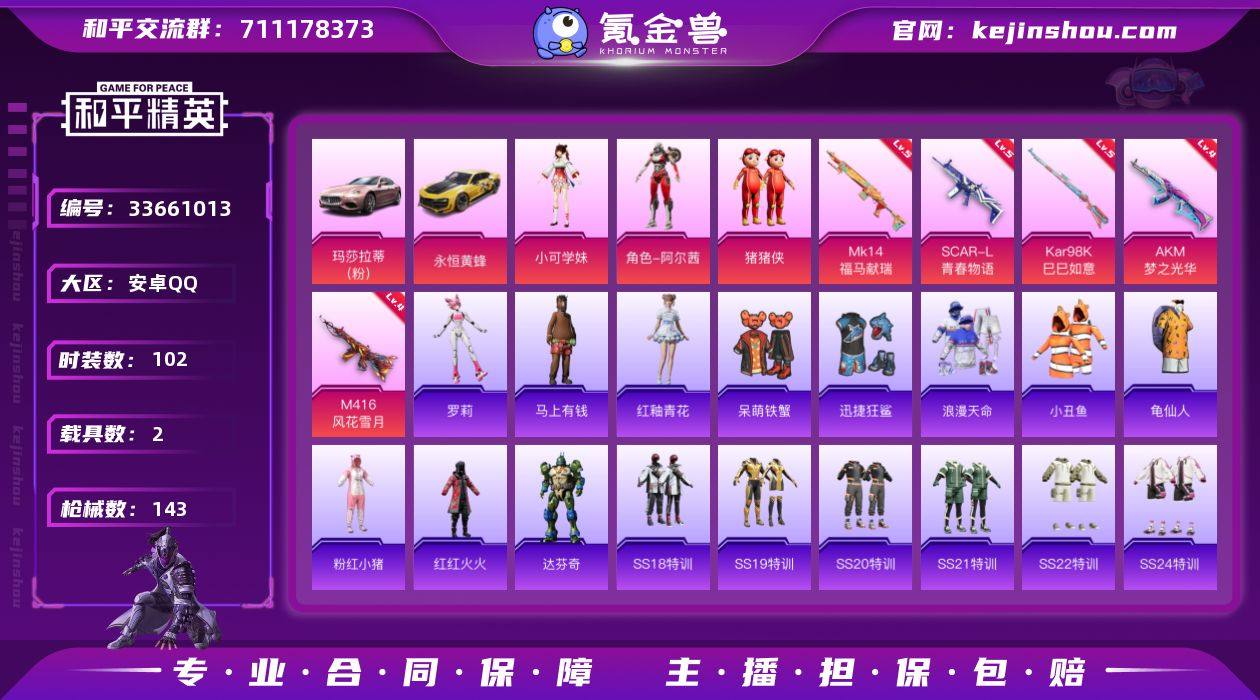 【LHPX2584】【特价出售/店主推荐--热门套装浪漫天命小丑鱼】安卓 手Q-3粉装-5特效枪-2载具-2粉色飞行器-44908热力值-5王牌印记-102套装-143枪皮【热门品类】:套装-浪漫天命,套装-小丑鱼,套装-龟仙人,套装-粉红小猪,套装-红红火火【粉色套装】:角色-小可学妹,角色-阿尔茜,玩偶服-猪猪侠【粉色枪皮等级】:AKM-梦之光华(四级),SCAR-L-青春物语(五级),M416-风花雪月(四级),Kar98K-巳巳如意(五级),Mk14-福马献瑞(五级)【粉色载具】:玛莎拉蒂Ghibli(粉),永恒黄蜂【粉色枪皮】:AKM-梦之光华,SCAR-L-青春物语,M416-风花雪月,Kar98K-巳巳如意,Mk14-福马献瑞【粉色飞行器】:炫彩糖果飞行器,拂晓神骑飞行器