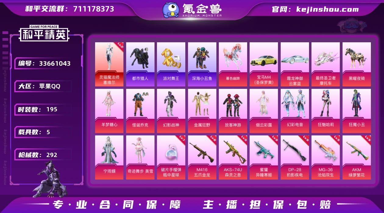 一红 小丑 金鞋 都市 眼罩 满级地铁苹果 手Q-1神装-11粉装-19特效枪-5载具-8粉色飞行器-95133热力值-15王牌印记-195套装-292枪皮 【红色神装等级】:灵猫魔法师-塞维尔(二级) 【红色角色神装】:灵猫魔法师-塞维尔 【热门品类】:粉装-怪诞乔克,套装-浪漫天命,套装-都市猎人,套装-派对舞王,套装-深海小丑鱼,套装-小丑鱼,套装-忍者信条,套装-暗夜之虎,套装-龟仙人,套装-暗影哥特 【粉色套装】:粉装-幻影战神,粉装-怪诞乔克,粉装-金属狂野,粉装-放客神游,角色-烟云彩露,粉装-幻彩电音,角色-狂魅哈莉,角色-狂魇小丑,角色-宁雨蝶,角色-奇迹舞步 美雪,角色-羊梦糖心 【粉色枪皮等级】:AKM-绿萝繁花(五级),SCAR-L-锦绣绵绵(五级),M416-五爪金龙(六级),M416-电玩时刻(五级),M416-灵猫魔法师(三级),AUG-星之彼岸(五级),AUG-暖羊咩咩(五级),蜜獾-异瞳寒姬(五级),ACE32-萌骑漫游(三级),Vector-最终圣卫者(三级),汤姆逊-热量炸弹(五级),AKS-74U-森灵之息(五级),Kar98K-巳巳如意(五级),Mk14-甜梦熊击(五级),Mk14-福马献瑞(四级),DP-28-豹影疾电(五级),MG-36-沧焰双生(五级),烟雾弹-电雾迷城(五级),破片手榴弹-瓶中星球(七级) 【粉色载具】:宝马M4...