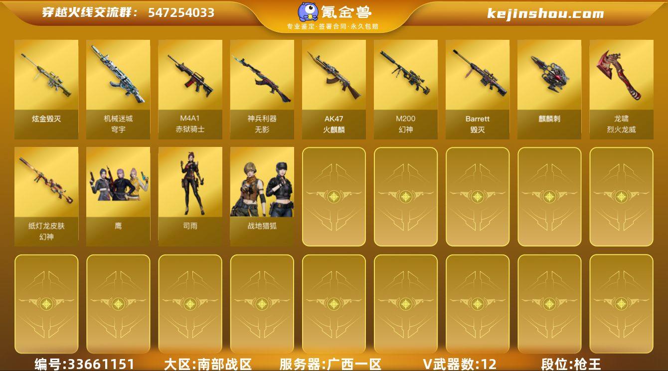 【ky7071】广西一区-22V-0王者武器数-1炫金武器数 【热门武器】:M200-幻神 【王者炫金武器】:炫金毁灭 【音效卡】:屠龙-电竞之星-竞星跃动音效卡,M4A1-雷神-云海游龙音效卡,HK417-朱雀-电竞之星-竞星跃动音效卡 【皮肤】:幻神-纸灯龙皮肤 【角色】:鹰,司雨,战地猎狐,太空指挥官,不败狙神,雪域霜狐,奇洋探员,乔伊教练,修道士,云海玲珑,幻面灵狐,斗烈龙骑,风暴女,嘉年华灵狐,娟娟,灵狐者-职业经理,潘多拉-X,潘多拉-甜心教官,潜龙队-X,蛇姬,斯沃特-X,蜀雪,兔囡囡,团团 【人偶武器】:AWM-灵狐-15周年嘉年华,生化手雷-机甲核心 【暴走生化】:双面神-竞魂 【挑战大师】:激光毁灭者III-白马银枪,神圣爆裂者-末日III 【英雄级武器】:AK47-火麒麟,无影-神兵利器,HK417-朱雀-电竞之星,机械迷城-穹宇,天罚-斗烈龙驹,Barrett-毁灭,M200-幻神,麒麟刺,屠龙-电竞之星,屠龙-斗烈龙驹,龙啸-烈火龙威,M4A1-赤狱骑士,AK47-竞魂无影 【其他武器】:源-千变,源·火麒麟*5,御·黑龙-龙太子,源·雷神*5,魂·M4A1-雷神-化蛇,魂·雷神-诺拉,魂·雷神-神秘按键,魂·雷神-维纳斯,魂·雷神-新春神龙,魂-雷神-萌杀*2,御·雷神-机甲刑天,御·雷神-烈虎*2,...