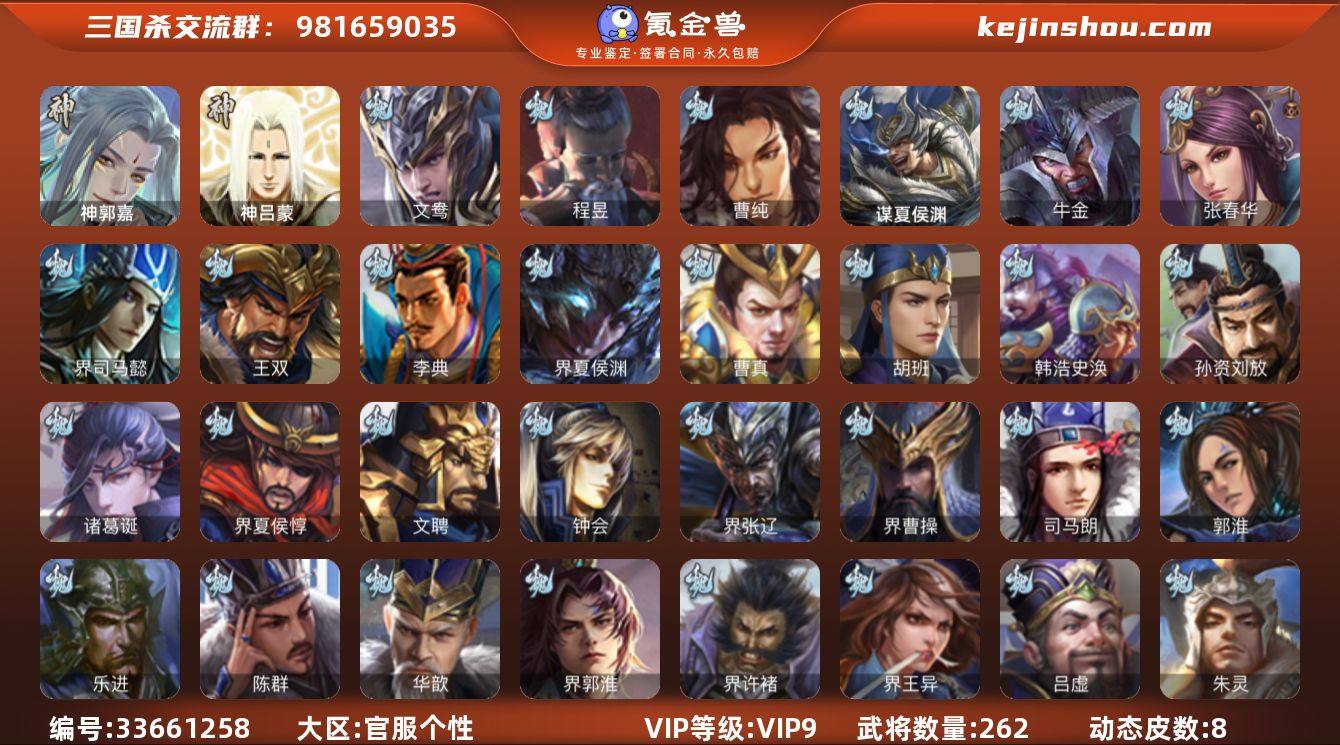 【JYSGS269】官阶:骠骑将军 VIP等级:VIP9级 史诗武将数:12 动态皮肤数:8 武将总数:262 史诗宝珠数:1 元宝数:1010 将魂数:3193 神郭嘉,曹纯,程昱,谋赵云,傅佥,谋陆逊,文鸯,星黄忠,麹义,卑弥呼,兀突骨,司马昭,神吕蒙,SP关羽,SP曹仁,乐进,曹昂,诸葛诞,朱灵,文聘,SP姜维,张春华,钟会,曹冲,郭淮,满宠,界王异,界曹操,界司马懿,界夏侯惇,界张辽,界许褚,界郭嘉,李典,曹真,韩浩史涣,陈群,曹叡,曹休,钟繇,司马朗,王基,孙资刘放,吕虔,鲁芝,杜畿,张恭,界曹植,界满宠,界郭淮,卞夫人,华歆,蔡贞姬,王双,崔琰,胡班,谋夏侯渊,牛金,界夏侯渊,SP孙尚香,夏侯霸,马良,关兴张苞,廖化,界马岱,关平,简雍,刘封,界法正,界关兴张苞,界刘备,界关羽,界赵云,界马超,SP徐庶,吴懿,周仓,张松,夏侯氏,糜竺,马忠,界黄月英,赵统赵广,严颜,界伊籍,界庞统,界孟获,界祝融,界姜维,界刘禅,吕凯,杨仪,邓芝,界简雍,费祎,糜夫人,许靖,宗预,彭羕,谋庞统,界张嶷,谋张飞,霍峻,诸葛果,甘夫人,鲁肃,凌操,大乔小乔,诸葛恪,诸葛瑾,孙鲁育,程普,韩当,潘璋马忠,虞翻,朱然,界甘宁,界黄盖,界周瑜,界大乔,界陆逊,孙鲁班,朱桓,顾雍,朱治,全琮,界孙尚香,潘濬,严畯,周妃,界孙策,许贡,界吴国太,界凌统,界韩当,蒋钦,界顾雍,界孙鲁班,谋周瑜,...
