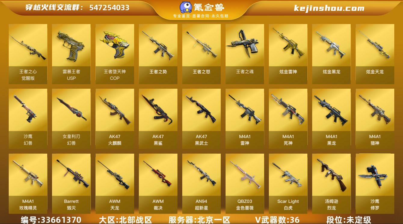 北京一区-42V-13王者武器数-4炫金武器数 【热门武器】:QBZ03-金色蔷薇,Scar Light-白虎,汤姆逊-烈龙,加特林-炼狱,沙鹰-修罗*3,炽芒蝶刃,高爆手雷-幻兽 【王者炫金武器】:王者之势,王者之怒*2,王者之魂,USP-雷暴王者,COP-王者堕天神,炫金黑龙*2,炫金雷神,炫金天龙 【音效卡】:Barrett-毁灭音效卡 【皮肤】:雷神-暗月,雷神-能量核心,黑龙-暗月,天启-暗月 【角色】:零,樱,瞳,魅影,兰-新年限定,曼陀罗-X,新娜塔莎,团团 【人偶武器】:COP-旗袍 【挑战大师】:AK47-冰龙粉碎者,激光毁灭者III 【英雄级武器】:AK47-火麒麟,M4A1-黑龙,M4A1-雷神,M4A1-死神,AK47-黑武士*2,AN94-超新星,AK47-黑鲨,Scar Light-白虎,QBZ03-金色蔷薇,M4A1-玫瑰精灵,M4A1-猎神,王者之心-觉醒版,AWM-天龙*2,Barrett-毁灭,AWM-裁决,加特林-炼狱,汤姆逊-烈龙,沙鹰-修罗*3,沙鹰-天神*3,沙鹰-幻兽,屠龙*3,龙啸,擎天,麒麟刺,炽芒蝶刃,女皇利刃-幻兽,高爆手雷-幻兽,高爆手雷-雷暴王者*2,闪光弹-幻兽,闪光弹-雷暴王者*2,烟雾弹-幻兽,烟雾弹-雷暴王者 【其他武器】:源·火麒麟*4,源·雷神,魂·雷神-新春神龙,源·天龙,魂·Barrett-朱雀- 新春神龙,魂·...