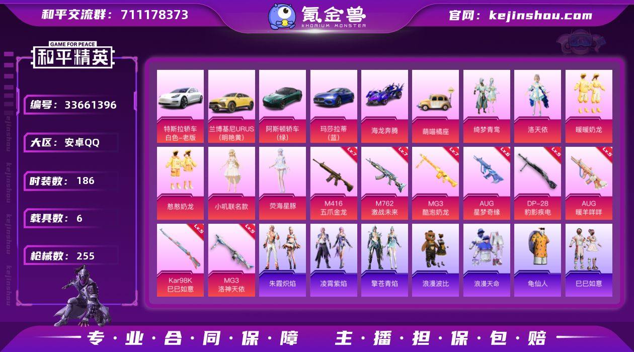 【LHPX2593】【6级星梦奇缘 特价出售/店主推荐】安卓 手Q-6粉装-10特效枪-6载具-1粉色飞行器-88406热力值-8王牌印记-186套装-255枪皮 【热门品类】:套装-浪漫天命,套装-SS1特训,套装-龟仙人,套装-浪漫波比 【粉色套装】:粉装-绮梦青鸾,角色-洛天依,粉装-暖暖奶龙,粉装-憨憨奶龙,角色-小叽联名款,角色-荧海星豚 【粉色枪皮等级】:M416-五爪金龙(七级),AUG-星梦奇缘(六级),AUG-暖羊咩咩(五级),M762-激战未来(七级),UMP45-萌骑冒险(三级),Kar98K-巳巳如意(五级),Mk14-福马献瑞(五级),DP-28-豹影疾电(五级),MG3-洛神天依(五级),MG3-酷泡奶龙(七级) 【粉色载具】:特斯拉Model 3(珍珠白),兰博基尼URUS(明艳黄),阿斯顿马丁DBS(绿),玛莎拉蒂Ghibli(蓝),海龙奔腾,萌喵橘座 【粉色枪皮】:M416-五爪金龙,AUG-星梦奇缘,AUG-暖羊咩咩,M762-激战未来,UMP45-萌骑冒险,Kar98K-巳巳如意,Mk14-福马献瑞,DP-28-豹影疾电,MG3-洛神天依,MG3-酷泡奶龙 【粉色飞行器】:绮梦青鸾飞行器 【粉色降落伞】:天启纪元降落伞,四圣焕新降落伞,锦绣火鲤降落伞,绮梦青鸾降落伞,星之彼岸降落伞,暗夜玫瑰降落伞,洛神天依降落伞,太空嘟嘟降落伞,小叽联名款降...