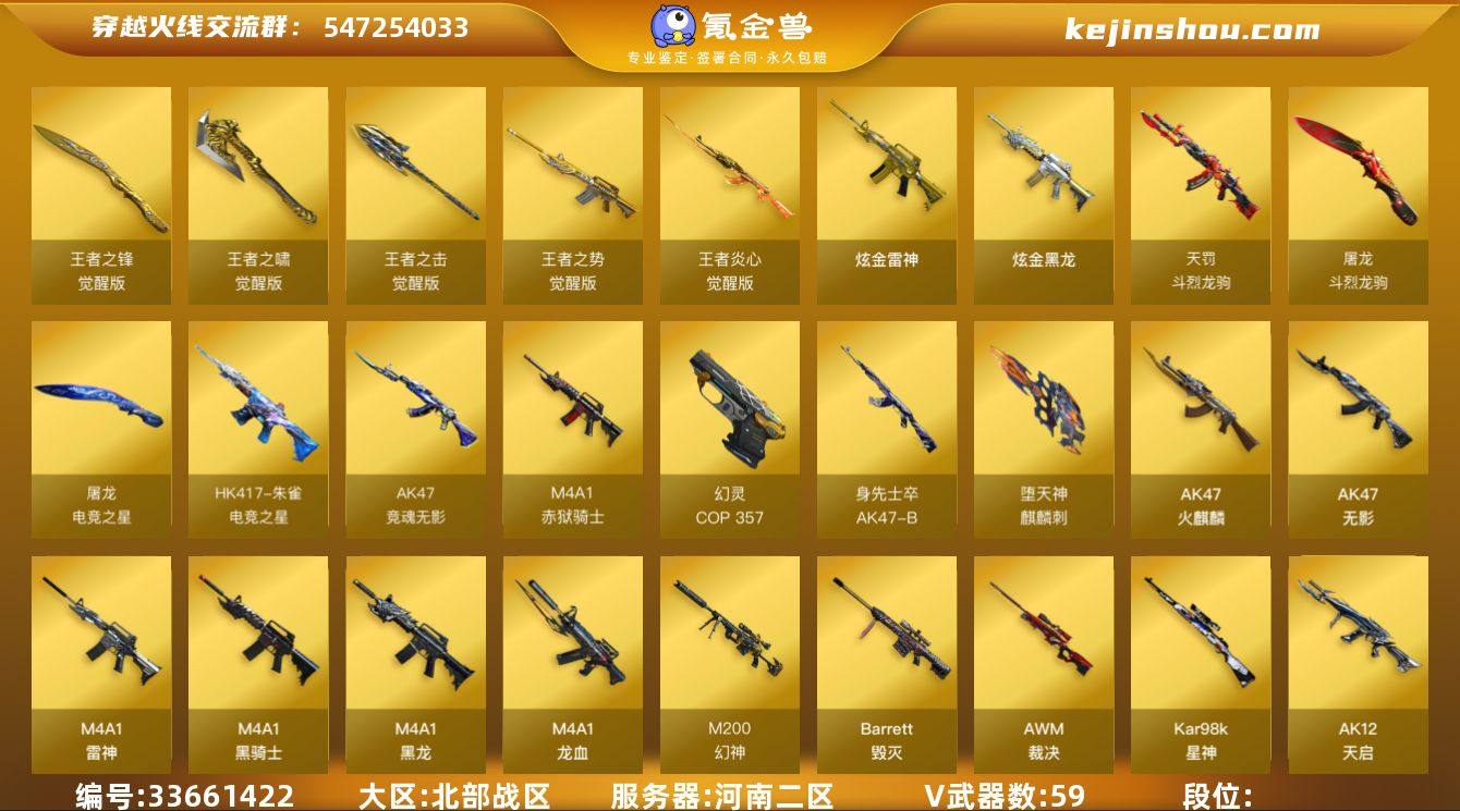 北部战区(河南二区)ys【精美爆破号】59v【M200-幻神+皮/周瑜,Kar98k-星神,ScarLight-白虎,QBZ03-金色蔷薇,AWM-裁决套+皮/星际旅行,COP 357-幻灵,扳手-能量核心,QBZ03-吕布】6王者【王者炎心,王者之势,王者之锋,王者之击,王者之啸】3炫金【炫金黑龙,炫金雷神,炫金骑士】3角色【战地猎狐,幻面灵狐,王者-瞳-闭月羞花,荆棘玫瑰,灵狐者-职业经理,职业选手】9音效【M4A1-雷神音效卡,M4A1-黑骑士音效卡,AWM-裁决音效卡,AK47-火麒麟音效卡,Barrett-毁灭音效卡,HK417-朱雀-电竞之星-竞星悦动音效卡,屠龙-电竞之星-竞星悦动音效卡,天罚-斗烈龙驹-斗烈音效卡,屠龙-斗烈龙驹-斗烈音效卡】21皮【幻神-周瑜,黑骑士-白马银枪,雷神-烈虎,裁决-星际旅行,黑骑士-冠军之势,毁灭-荣耀之怒,火麒麟-轻羽,毁灭-CFS2020,毁灭-黑大圣】 截图展示段位不代表实际段位 如赛季更新等不可抗拒因素发生变化、时限道具不保证所剩时间