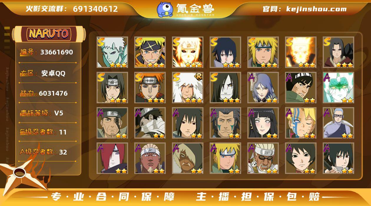 11S忍/32A忍/战力603W/V5/区服1910 【S忍者】 宇智波带土「十尾人柱力」,宇智波佐助「漩涡鸣人」,宇智波佐助「永恒万花筒」,漩涡鸣人「九喇嘛连结」,自来也「舞之豪杰」,宇智波鼬「秽土转生」,宇智波鼬「须佐能乎」,佩恩「天道」,波风水门,大蛇丸,波风水门「九喇嘛连结」, 【A忍者】 小南「神驹佑将」,巳月「仙人模式」,迈特凯「青春爆炸」,土台「忍界大战」,长十郎「六代目水影」,漩涡博人「桃式显现」,日向雏田「最终章」,不动,宇智波泉奈,桃地再不斩「秽土转生」,长门「青年」,艾「青年」,达鲁伊「五代目雷影」,波风水门「青年」,奇拉比「忍界大战」,黑土「四代目土影」,宇智波佐助「须佐能乎」,迪达拉「秽土转生」,宇智波带土「暴怒」,漩涡鸣人「九尾查克拉」,千代「近松十人卫」,药师兜「半蛇斗篷」,秋道丁次「忍界大战」,猿飞阿斯玛「秽土转生」,宇智波佐助「万花筒写轮眼」,飞段「死司凭血」,飞段,我爱罗「疾风传」,蝎,干柿鬼鲛,猿飞阿斯玛,迈特凯, PX_2571633