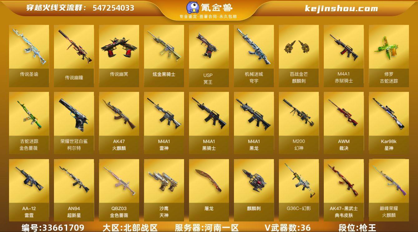 【ky7068】河南一区-40V-1王者武器数-1炫金武器数 【传说武器】:传说圣谕,传说幽瞳,传说幽冥 【传说角色】:传说星骇 【热门武器】:传说幽瞳,传说圣谕,传说幽冥,G36C-幻影,QBZ03-金色蔷薇*2,M200-幻神,柯尔特-荣耀世冠白鲨2023,金色蔷薇-古蛇迷踪,修罗-古蛇迷踪,Kar98K-星神,牛牛-AK47,M4A1-黑骑士,COP-白鲨 【王者炫金武器】:王者冰锋,炫金骑士 【音效卡】:屠龙-电竞之星-竞星跃动音效卡,AWM-裁决音效卡,HK417-朱雀-电竞之星-竞星跃动音效卡,死神-雪域霜狐-怀旧音效卡 【皮肤】:幻神-AG-CFPL S24冠军 皮肤,幻神-荣耀世冠EP 皮肤,星神-璀璨皮肤,裁决-巅峰荣耀 皮肤,白虎-白鲨-CFPLS23冠军,金色蔷薇-纸灯龙皮肤,火麒麟-巅峰荣耀,火麒麟-典雅胡桃 皮肤,火麒麟-斗烈龙驹 皮肤,黑武士-典韦皮肤,屠龙-荣耀世冠AG,轻型军用手斧-再燃火线,麒麟刺-月皮肤 【角色】:晴雅,荆棘,战地猎狐,不败狙神,雪域霜狐,蛇隐宗,葵-阿尔法武装,幻面灵狐,斗烈龙骑,初恋灵狐,芳心审判者,嘉年华灵狐,零-水下丽影,潘多拉-甜心教官,蛇姬,影武者-X 【人偶武器】:COP-白鲨,Scar Light-马枪,AWM-灵狐-15周年嘉年华,牛牛-AK47,生化手雷-机甲核心 【暴...