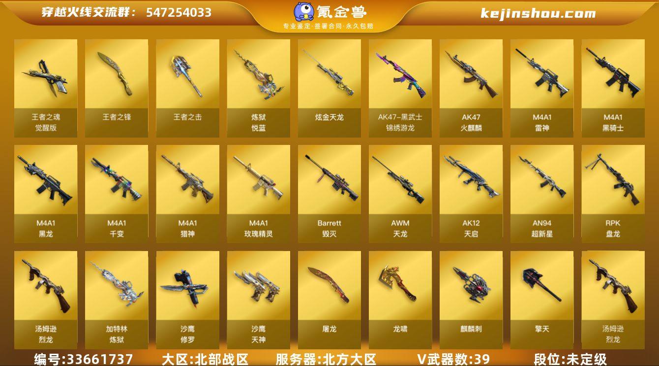北方大区-41V-4王者武器数-1炫金武器数 【热门武器】:死亡之眼,金色小号,毒蜂,M4A1-黑骑士,汤姆逊-烈龙*6,RPK-盘龙*5,加特林-炼狱,沙鹰-修罗*3 【王者炫金武器】:炼狱-悦蓝,王者之击,王者之锋,炫金天龙 【音效卡】:Barrett-毁灭音效卡 【皮肤】:雷神-源计划2.0专属 皮肤,火麒麟-平天大圣,毁灭-暗月*2,毁灭耀金皮肤,黑龙-能量核心,黑骑士-暗月,无影-暗月*2,天龙-秘银,修罗-能量核心*2 【角色】:魅影,芳心审判者,飞虎队-X,风暴女,疾风,娟娟,麻雀,潘多拉-X,青霞仙子,铁骑荣耀,兔囡囡,铁扇公主-暗灵,樱-战斗天使,影武者-X,游珑儿,智影 【人偶武器】:火麒麟-灵狐,COP-旗袍,迷你牛牛,生化手雷-机甲核心*3,灵狐娃娃手雷*2 【暴走生化】:毒蜂,死亡之眼 【挑战大师】:冰龙粉碎者-白马银枪,激光毁灭者III-白马银枪,激光毁灭者III,神圣爆裂者-末日III 【英雄级武器】:M4A1-千变,AK47-火麒麟*3,M4A1-黑龙,M4A1-雷神,M4A1-黑骑士,AK12-天启,AN94-超新星,黑武士-锦绣游龙,M4A1-玫瑰精灵,M4A1-猎神,AWM-天龙*2,Barrett-毁灭,RPK-盘龙*5,加特林-炼狱,汤姆逊-烈龙*6,沙鹰-修罗*3,沙鹰-天神*2,王者之魂-觉醒版,屠龙*2,龙...