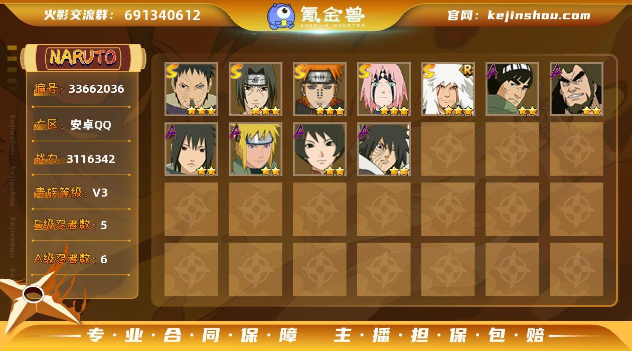 5S忍/6A忍/战力311W/V3/区服3681 【S忍者】 春野樱「忍界大战」,宇智波带土「忍界大战」,自来也「舞之豪杰」,宇智波鼬「须佐能乎」,佩恩「天道」, 【A忍者】 迈特凯「青春爆炸」,宇智波泉奈,神农「羁绊」,波风水门「青年」,黑土「四代目土影」,宇智波带土「暴怒」, PX_2541704