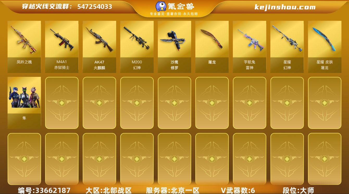 【ky7062】北京一区-8V-1王者武器数-0炫金武器数 【热门武器】:M200-幻神,凤吟之魄,沙鹰-修罗 【王者炫金武器】:凤吟之魄 【音效卡】:AK47-火麒麟音效卡 【皮肤】:幻神-星耀 皮肤,雷神-宇航兔皮肤,雷神-化蛇 皮肤,黑鲨-绝影之心 皮肤,屠龙-星耀 皮肤 【角色】:隼,乔伊教练,修道士,暗夜-X,风暴女,嘉年华灵狐,娟娟,灵狐-花神,龙儿,麻雀,斯沃特-X,蜀雪,游珑儿 【人偶武器】:街机小灰机,AWM-灵狐-15周年嘉年华,生化手雷-机甲核心,深渊终结者手雷,灵狐娃娃手雷 【挑战大师】:冰龙粉碎者-白马银枪,神圣爆裂者-末日III,惩戒者III 【英雄级武器】:AK47-火麒麟,M200-幻神,沙鹰-修罗,屠龙,闪光弹-竞技荣光,M4A1-赤狱骑士,AN94-竞魂超新星 【其他武器】:源·火麒麟,源-黑龙,源·雷神,魂·M4A1-雷神-化蛇,魂·雷神-诺拉,魂·雷神-维纳斯,魂·雷神-新春神龙,魂-雷神-萌杀,魂·雷神-15周年嘉年华,御·雷神-机甲刑天,御·雷神-烈虎,源·黑骑士*2,魂·黑骑士-现代金属,魂·黑骑士-幻能朋克,魂·黑骑士-破浪10年,魂·黑骑士-娜塔莉娅,魂·黑武士-锋芒破茧,源·天启,魂·超新星-春桃,源·武圣*2,源·机械迷城,源·青龙,M4A1-青龙-掌上穿越火线,魂·HK4...