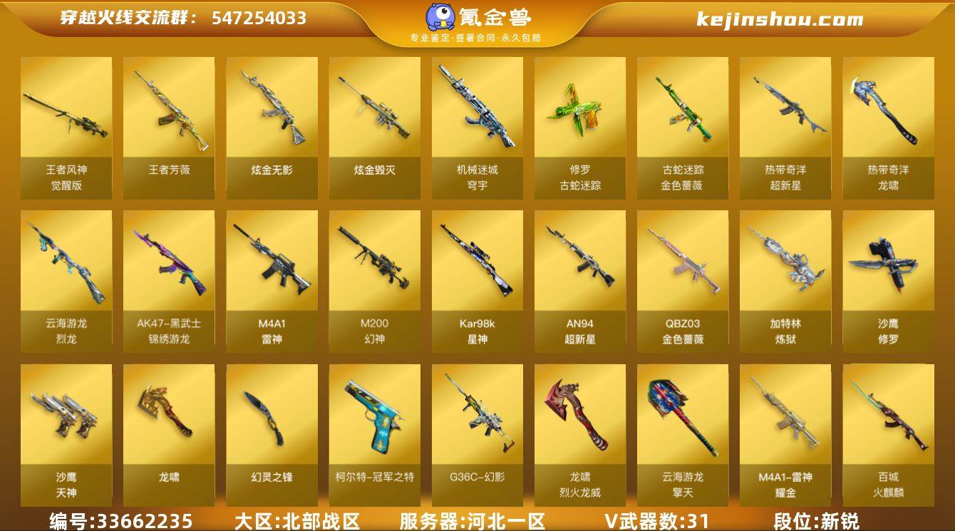 河北一区-29V-4王者武器数-2炫金武器数 【热门武器】:G36C-幻影,QBZ03-金色蔷薇,M200-幻神,金色蔷薇-古蛇迷踪,修罗-古蛇迷踪,柯尔特-冠军之特,Kar98K-星神,加特林-炼狱,毁灭-孙三炮,沙鹰-修罗 【王者炫金武器】:王者芳薇,高爆手雷-雷霆王者,炫金无影,炫金毁灭 【音效卡】:Kar98K-星神音效卡,擎天-云海游龙音效卡,QBZ03-金色蔷薇-热带奇洋音效卡 【皮肤】:幻神-冠军之幻,幻神-纸灯龙皮肤,雷神-荣耀之魄,雷神-耀金皮肤,火麒麟-百城,毁灭-荣耀之怒,无影-能量核心,龙啸-纸灯龙皮肤 【角色】:鹰,王者潘多拉,蛇隐宗,奇洋探员,云海玲珑,暗夜-X,飞虎队-X,风暴女,卡塔琳娜,麻雀,曼陀罗-X,蛇姬,蜀雪,兔囡囡,游珑儿 【人偶武器】:毁灭-孙三炮,迷你宝贝*2,迷你牛魔王 【暴走生化】:超级对讲机 【挑战大师】:激光毁灭者III-白马银枪 【英雄级武器】:M4A1-雷神,AN94-超新星,QBZ03-金色蔷薇,黑武士-锦绣游龙,G36C-幻影,超新星-热带奇洋,金色蔷薇-古蛇迷踪,机械迷城-穹宇,M200-幻神,Kar98K-星神,王者风神-觉醒版,加特林-炼狱,炼狱-悦蓝-觉醒版,烈龙-云海游龙,沙鹰-修罗,沙鹰-天神,柯尔特-冠军之特,修罗-古蛇迷踪,龙啸,幻灵...
