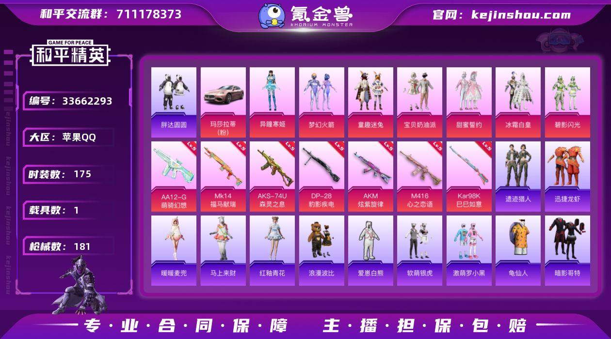DAS13066 精品妹妹号 (可二次实名) 苹果Q-1稀有1载具7粉装7特效枪18热门175套装181枪皮 59451热力值 11印记 历史超级王牌12星 梦幻火箭 宝贝奶油派 【1稀有】 AKM-百万伏特 【1载具】 玛莎拉蒂粉色 【7粉装】 梦幻火箭 宝贝奶油派 异瞳寒姬 甜蜜誓约 童趣迷兔 冰霜白皇 碧影闪光 【7特效枪】 M416-心之恋语 (5级) AKM-炫紫旋律 (5级) AKS-74U-森灵之息 (5级) Kar98K-巳巳如意 (5级) DP-28-豹影疾电 (5级) Mk14-福马献瑞 (5级) AA12-G-萌骑幻想 (5级) 【18热门】 龟仙人 红熊茄茄 青涩年华 雪山精英 糯粉咩咩 爱崽白熊 软萌银虎 激萌罗小黑 浪漫波比 胖达圆圆 暗夜契约 暗影哥特 团圆交子 瑞龙福将 纯白誓言 破蛋小黄鸡 极速红龙 M762-瑞龙福将 【2飞行器】 镜光幻境飞行翼 绚金瑰梦飞行器 【4头盔】 梦幻火箭头盔 甜心宝贝头盔 百万伏特头盔 甜蜜誓约头盔 【5背包】 梦幻火箭背包 甜心宝贝背包 金风玉露背包 神秘黑猫背包 甜蜜誓约背包