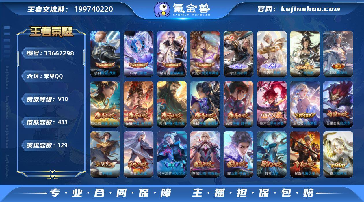 无二次-苹果Q-V10-至尊星耀III段位-129英雄-433皮肤-4典藏皮肤-1典藏英雄-2无双-1珍品传说-54传说-121史诗QW2641613 【英雄全皮】:孙权全皮,娜可露露全皮,橘右京全皮,狂铁全皮,李信全皮,猪八戒全皮,敖隐全皮,鲁班大师全皮,蒙恬全皮,空空儿全皮,影全皮 【荣耀典藏】:武则天英雄,武则天倪克斯神谕,李白鸣剑曳影,诸葛亮星域神启,貂蝉幻阙歌 【无双皮肤】:李信问心剑,孙悟空无相 【珍品传说】:伽罗沧流箭 【传说皮肤】:韩信踏浪归,云缨神骥越千峰,关羽神骥镇沧海,狄仁杰神骥赴朔漠,貂蝉神骥聚万邦,马超神骥逐星野,花木兰异界灵契,王昭君长夜焕生,赵云乘龙铭钟鼎,艾琳觅芳踪,东皇太一灼幽烈阳,夏洛特浮生妄,项羽无限倾心,小乔山海琳琅生,曜山海苍雷引,李信山海炽霜斩,吕布怒海麟威,百里守约碎云,橘右京枫霜尽,娜可露露前尘镜,马可波罗深海之息,后羿无尽星芒,马超无双飞将,露娜启示之音,孙策末日机甲,赵云淬星耀世,王昭君乞巧织情,曜李逍遥 ,小乔音你心动,诸葛亮时雨天司,镜炽阳神光,虞姬启明星使,孙悟空零号赤焰,关羽武圣,曜云鹰飞将,李信一念神魔,伽罗太华,貂蝉猫影幻舞,张良黄金白羊座,干将莫邪久胜战神,虞姬云霓雀...