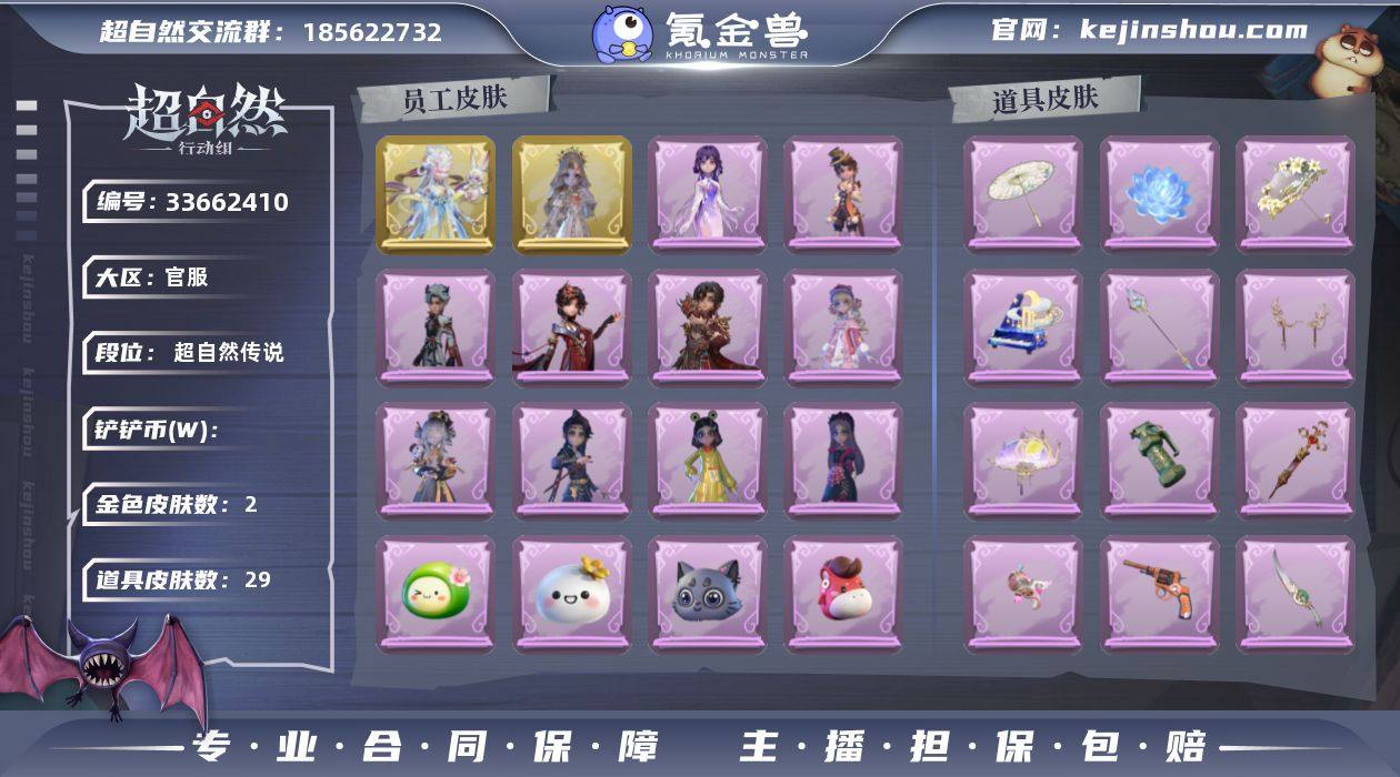 金皮2;紫皮11;道具皮29; 皮肤:莉莉-瑶台梦,薇薇安-圣光之谕,小黄-呱呱雨衣,爱丽丝-丝缕哀歌,爱丽丝-甜梦派对,零-搬开山,阿念-庆宴绮愿,艾伦-黎明猎手,薇薇安-仙锋小姐,巫铃儿-琢玉怀乡,莉莉-除妖小师妹,逍遥-绣春逍影,爱丽丝-耀眼的你;道具:伞-沐春颂,闪光弹-金戈玄铜,桃木剑-小羊波德莱尔剑,夜视仪-心跳眼镜,音响-月光奏鸣曲,长枪-波塞冬,夜视仪-敛花容,专业手电-云端梦想计划,摸金符-花落精绝,转轮手枪-新星时代,铲子-龙鳞,急救包-末章心跳,折扇-赴此良宵,腰包-红运福虎,桃木剑-绯色遗证,音响-鸣沙鼓,传送按钮-逆时审判,腰包-惊魂娃娃,摸金符-紫霄,刺刀-碧络琅环,急救包-蔷薇物语,黄牛能量饮料-青玉抱丹,长鞭-缚誓之锁,电击枪-甜蜜泡泡枪,传送按钮-幻宠之门,伞-郁金春信,除颤仪-冰晶般的代价,荧光棒-花火-荧光棒-花火,伞-伞; 美妆:美妆-萌兔气泡; 饰品:头饰-卑微头套,头饰-芝麻糊汤圆,头饰-小狗蛇点点头套,头饰-呆滞头套,头饰-青团糯糯,头饰-鳄霸天头套,头饰-炙热烧烤,头饰-哈士奇头套,头饰-煤球喵头套,头饰-嘻嘻头套,头饰-烈焰红唇头套,头饰-饺饺者头套,头饰-火爆了头套,头饰-萨卡班甲鱼头套,头饰-马上有...