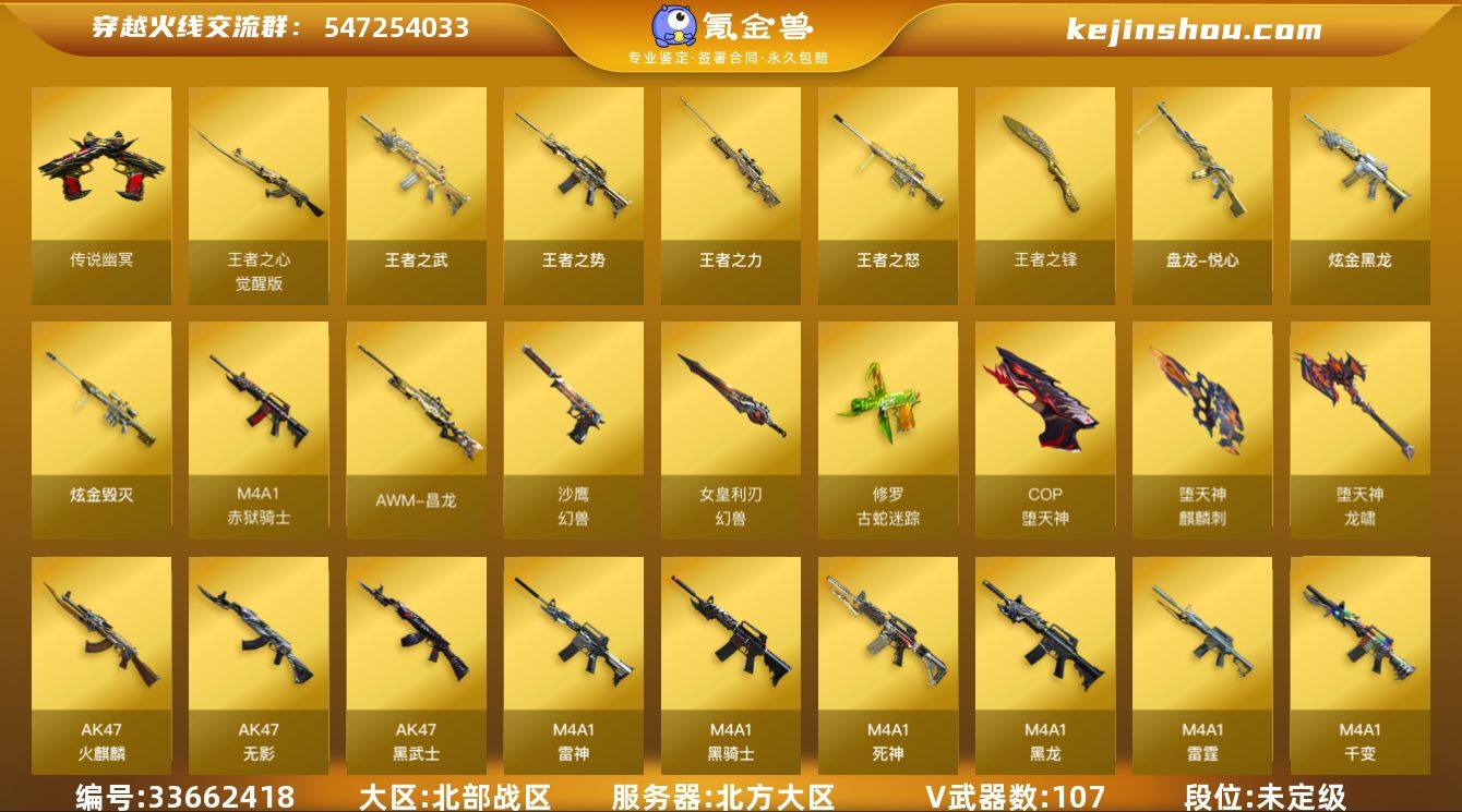 北方大区-112V-11王者武器数-3炫金武器数 【传说武器】:传说幽冥 【热门武器】:传说幽冥,修罗-古蛇迷踪,死亡之眼,M4A1-黑骑士*2,汤姆逊-烈龙*6,RPK-盘龙,COP-堕天神,沙鹰-修罗*5,高爆手雷-幻兽 【王者炫金武器】:王者之势,王者之武,王者之怒,王者之力,盘龙-悦心*4,王者之锋,炫金骑士,炫金黑龙,炫金毁灭 【音效卡】:M4A1-黑骑士音效卡,Barrett-毁灭音效卡,Barrett-碧霄极光音效卡 【皮肤】:裁决-巅峰荣耀 皮肤,雷神-暗月,雷神-能量核心,雷神-荣耀之魄,雷神-维纳斯皮肤,雷神-源计划2.0专属 皮肤,火麒麟-巅峰荣耀,毁灭-暗月,毁灭-荣耀之怒,毁灭-英雄计划 皮肤,黑龙-暗月,黑骑士耀金皮肤,无影-能量核心,烈火-动感闪耀 皮肤,战神-粉色甜心皮肤,战神-紫绶金章皮肤*5,战神-流金岁月皮肤*3,天龙-能量核心,AWM-天龙-传奇白鲨,极光-能量核心,修罗-能量核心,屠龙-荣耀之锋 【角色】:葵,炫,迷迭香,零·纪元,战地猎狐,王者-救世主,蛇隐宗,奇洋探员,乔伊教练,云海玲珑,斗烈龙骑,空,暗夜-X,风暴女,娟娟,灵狐者-X,龙儿,蛇姬,斯沃特-X,蜀雪,铁扇公主-暗灵,潘多拉-N 【人偶武器】:迷你钢铁终结者,迷你救赎猎手,巴雷特-零-...